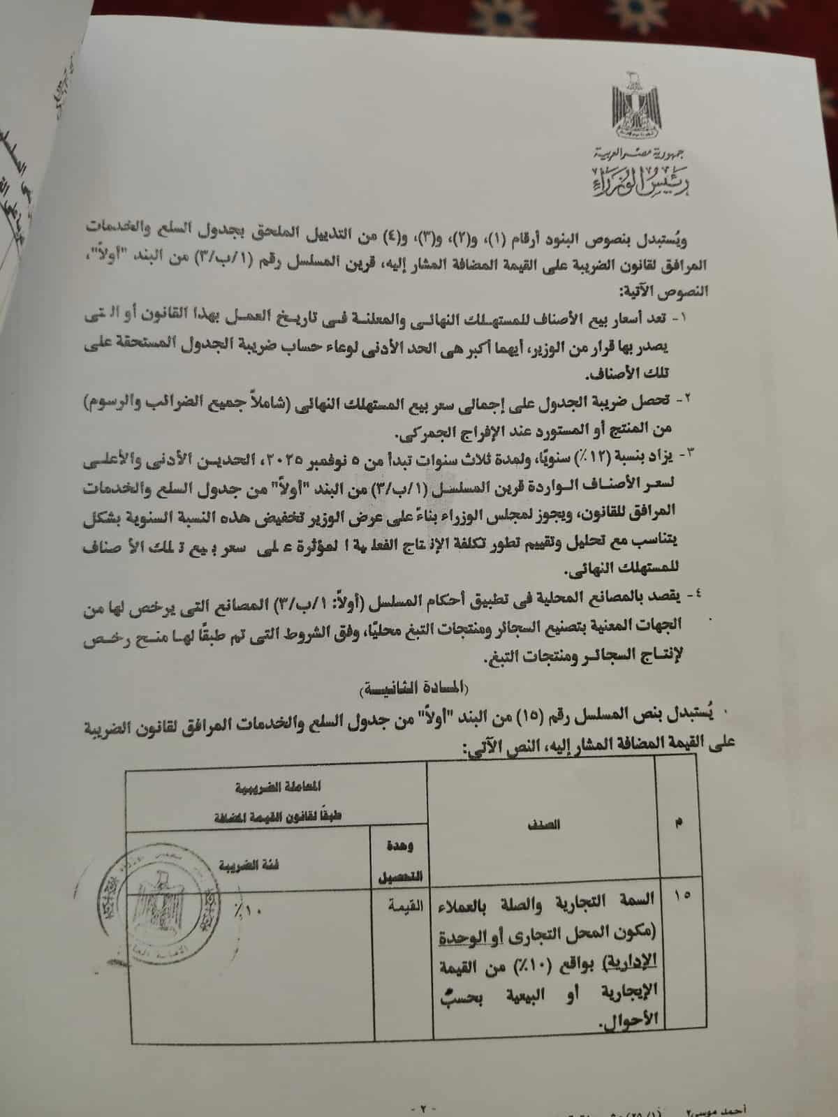 أولا من جدول السلع والخدمات المرافق لقانون الضريبة على القيمة المضافة المشار إليه، بما يسمح بزيادة الفئة الضريبة القطعية وزيادة الحد الأقصى لأسعار أصناف السجائر المنتجة من المصانع المحلية، والتى لا يزيد سعر بيعها للمستهلك النهائى على 38,88 جنيه، ليصبح الحد الأقصى لسعر بيعها للمستهلك النهائى ٤٨ جنيهاً، وأصناف السجائر المصنعة محلياً والتى يزيد سعر بيعها للمستهلك النهائى على 38,88 جنيه ولا يجاوز ٥٦,٤٤ جنيه، ليصبح الحد الأدنى لسعر بيعها ٤٨ جنيهاً والحد الأقصى لا يجاوز ٦٩ جنيهاً، أو المستوردة التى لا يجاوز سعرها ٥٦,٤٤ جنيه، ليصبح الحد الأقصى لسعر بيعها ٦٩ جنيهاً، وأصناف السجائر المصنعة محلياً أو المستوردة والتى يزيد سعر بيعها للمستهلك النهائى على ٥٦,٤٤ جنيه، ليصبح الحد الأقصى لسعر بيعها ٦٩ جنيهاً.
