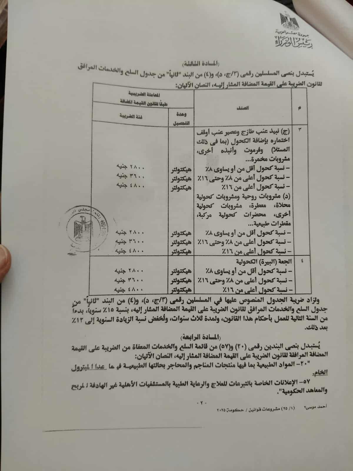المادة الثالثة نصت على استبدال المسلسلين رقمى (۳) ج، (د)، و(٤) من البند ثانياً من جدول السلع والخدمات المرافق لقانون الضريبة على القيمة المضافة المشار إليه بما شأنه تعديل المعاملة الضريبية للمشروبات الكحولية بتعديل وحدة التحصيل وفئة الضريبة عليها والتحول من نظام الضريبة النسبية (نسبة مئوية من السعر) لنظام الضريبة القطعية، وذلك بغرض الالتزام بتطبيق المواصفات القياسية التى قررتها منظمة الصحة العالمية فى هذه الصناعة من خلال فرض ضرائب تصاعدية طبقاً لزيادة نسب الكحول فى المشروبات الكحولية، وحفاظاً على الصحة العامة للمستهلك، مع النص على أن تزاد سنوياً بنسبة (١٥) لمدة ثلاث سنوات تبدأ من السنة التالية للعمل بأحكام هذا القانون فئة الضريبة المنصوص عليها، وتخفض نسبة الزيادة إلى (١٢%) سنوياً بعد ذلك.