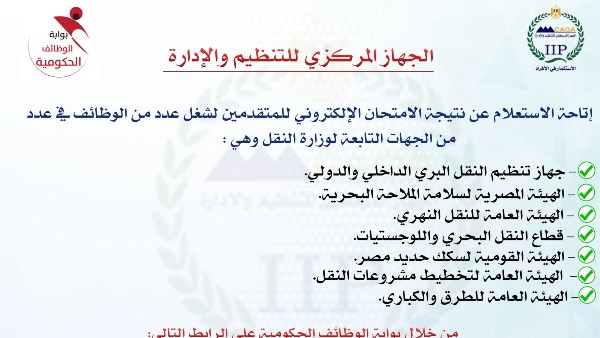– مسابقة شغل وظائف بجهاز تنظيم النقل البري الداخلي والدولي.