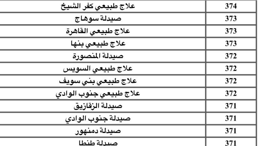 وتأتي بعد كلية الطب البشري في الكليات الأكثر إقبالا بشعبة علمي علوم، كليات طب الاسنان والتي من المتوقع أن يصل الحد الأدنى للقبول بها إلى 93%، ومن بعدها الصيدلة 91.7%، والعلاج الطبيعي 92.3%، وذلك بالرجوع إلى أعداد الطلاب الحاصلون على مجموع حتى 293 درجة، أي 91.5%، والذين وصل عددهم حوالي 21,645 طالب، ومن المرجح أن تتلقى بعض الأماكن لطلاب المرحلة الثانية بكليات الطب البيطري والعلوم.