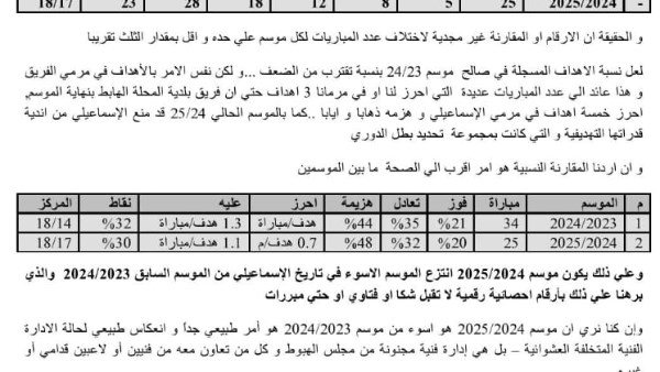 بالأرقام.. جبهة إنقاذ الإسماعيلي تصدر بيانا تفصيليا عن سوء نتائج موسم 2025