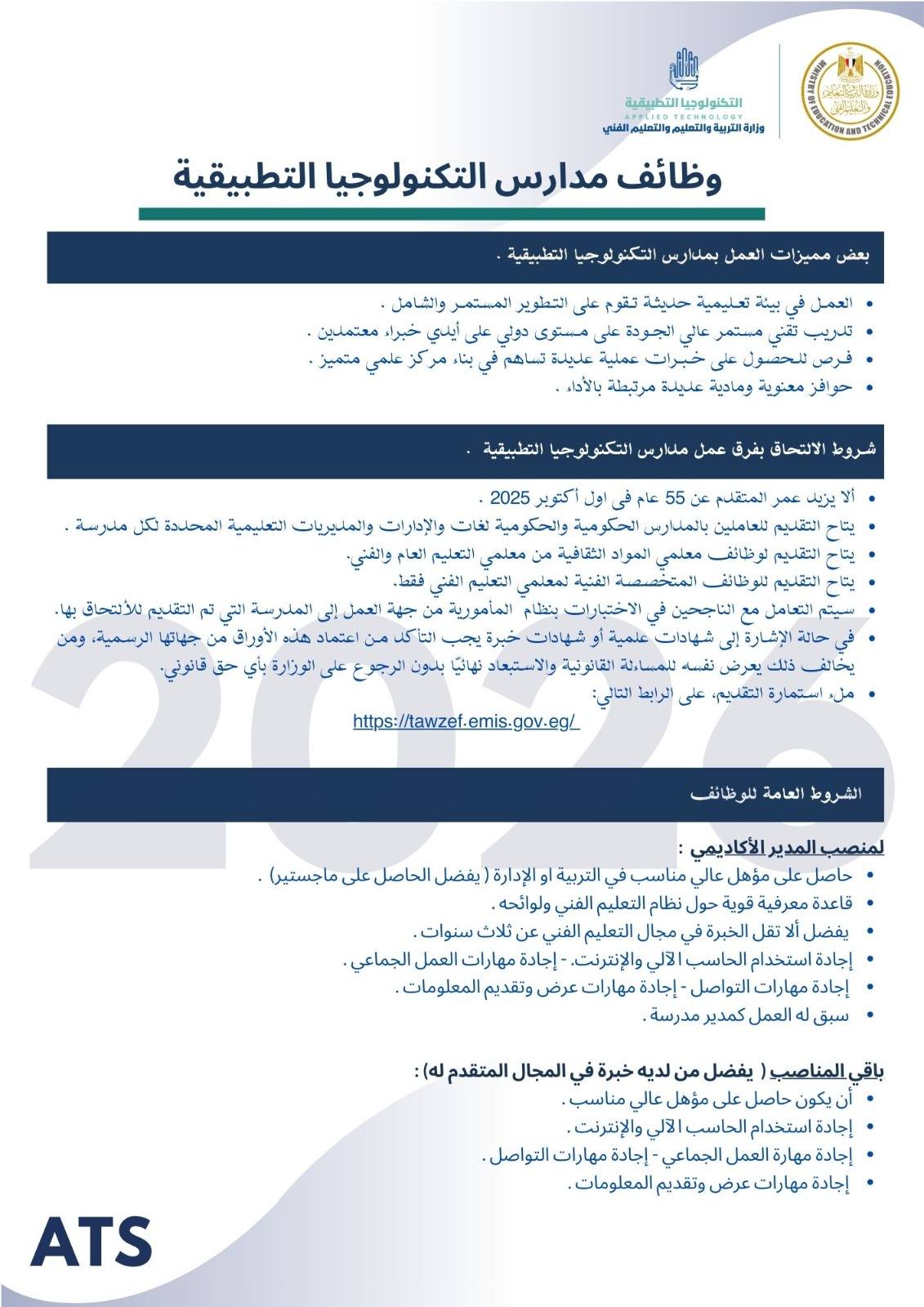 -ادخل على رابط وظائف مدارس التكنولوجيا التطبيقية https://tawzef.emis.gov.eg