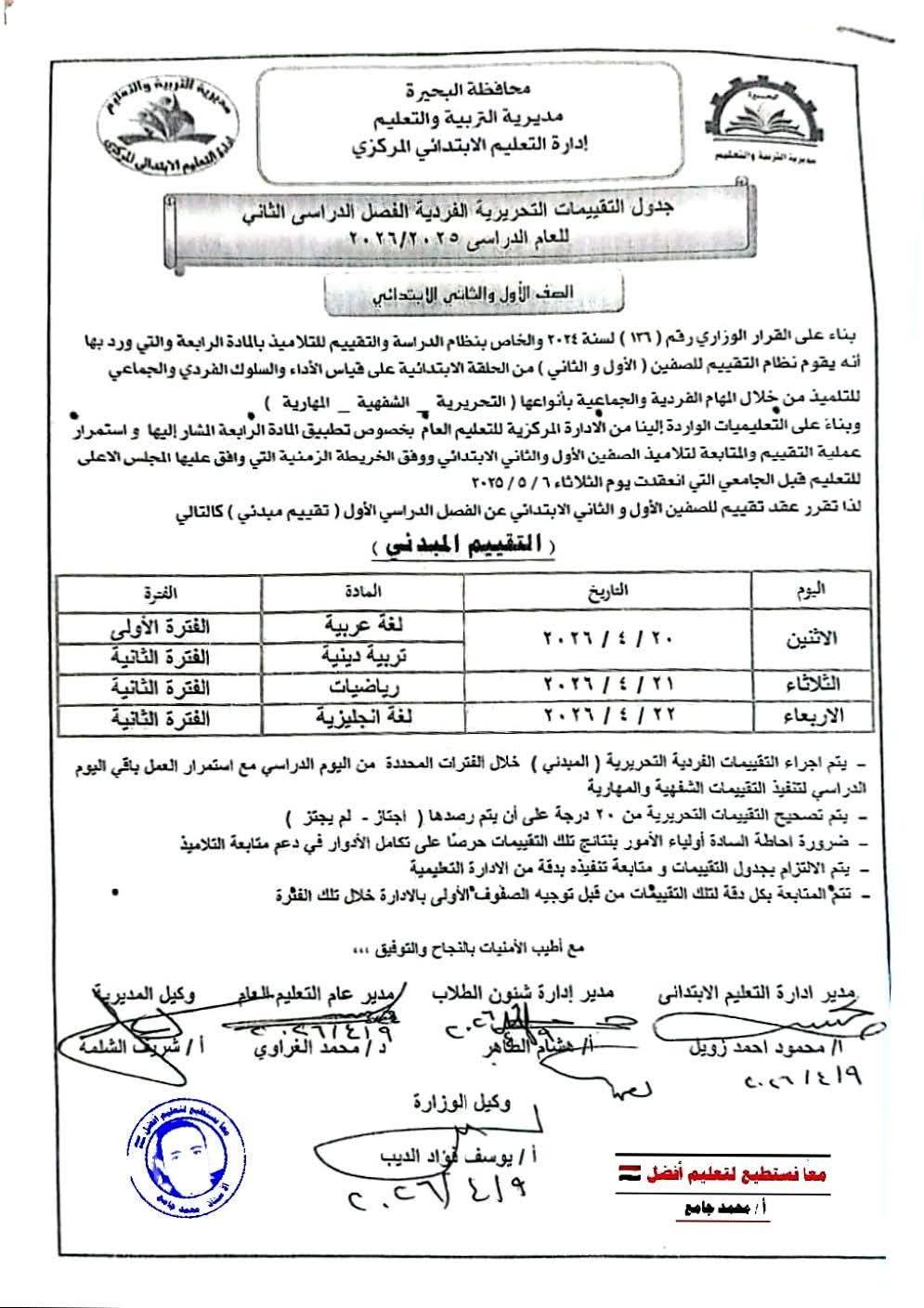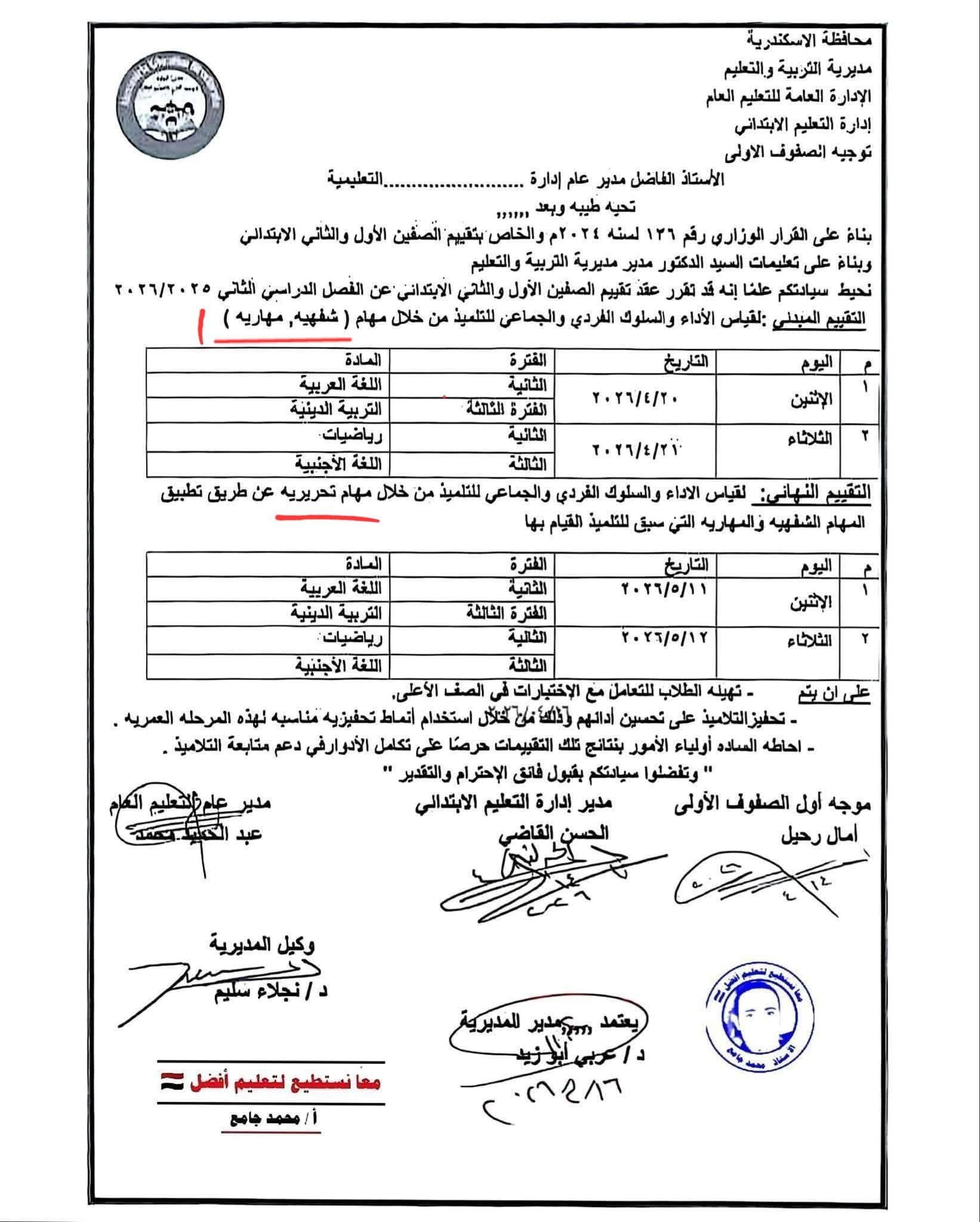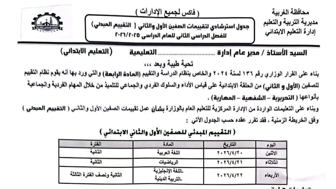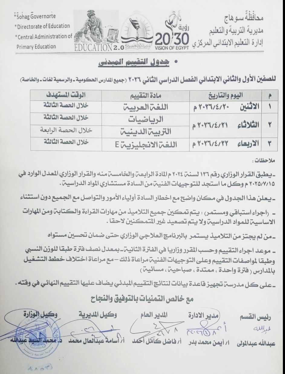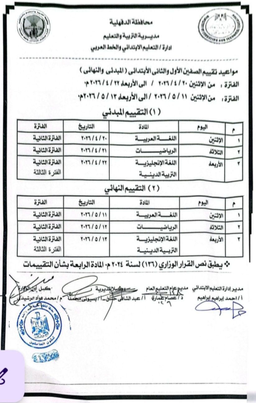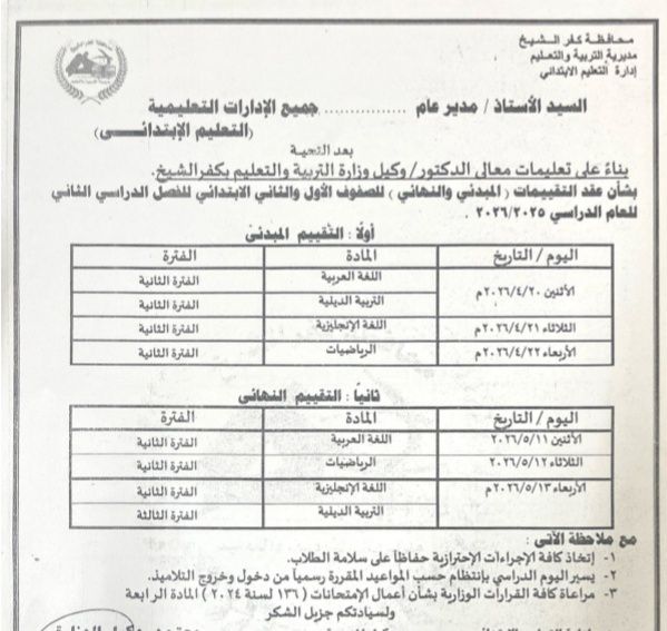 يأتي ذلك تنفيذاً لقرارات وزارة التربية والتعليم والتعليم الفني ، التي قررت أن يكون موعد التقييم المبدئي للصفين الأول والثاني الإبتدائي الترم الثاني 2026 ، من 20 ابريل 2026 حتى 22 ابريل 2026