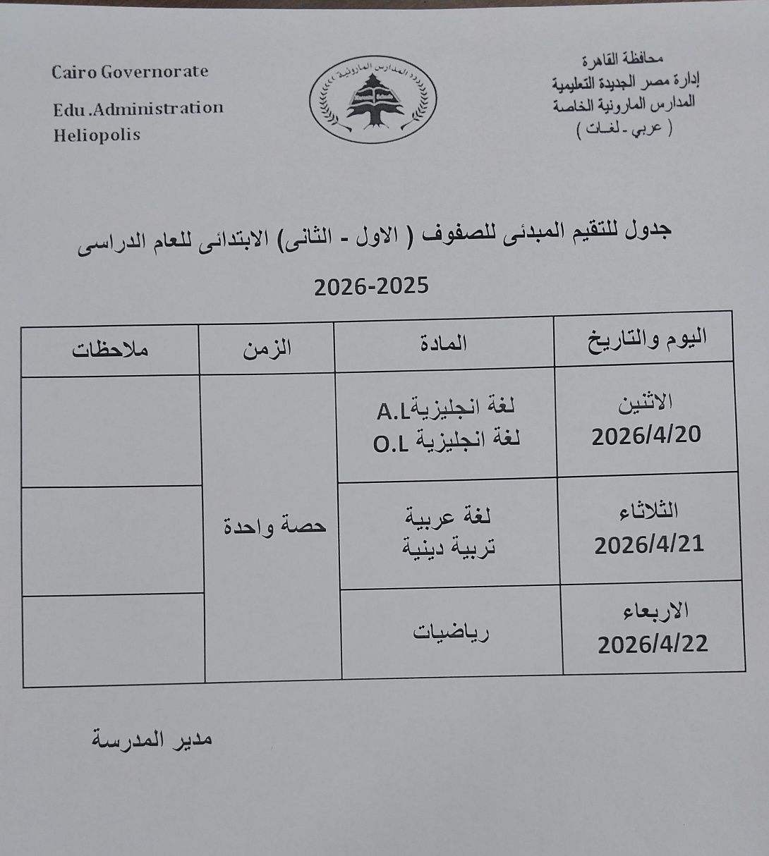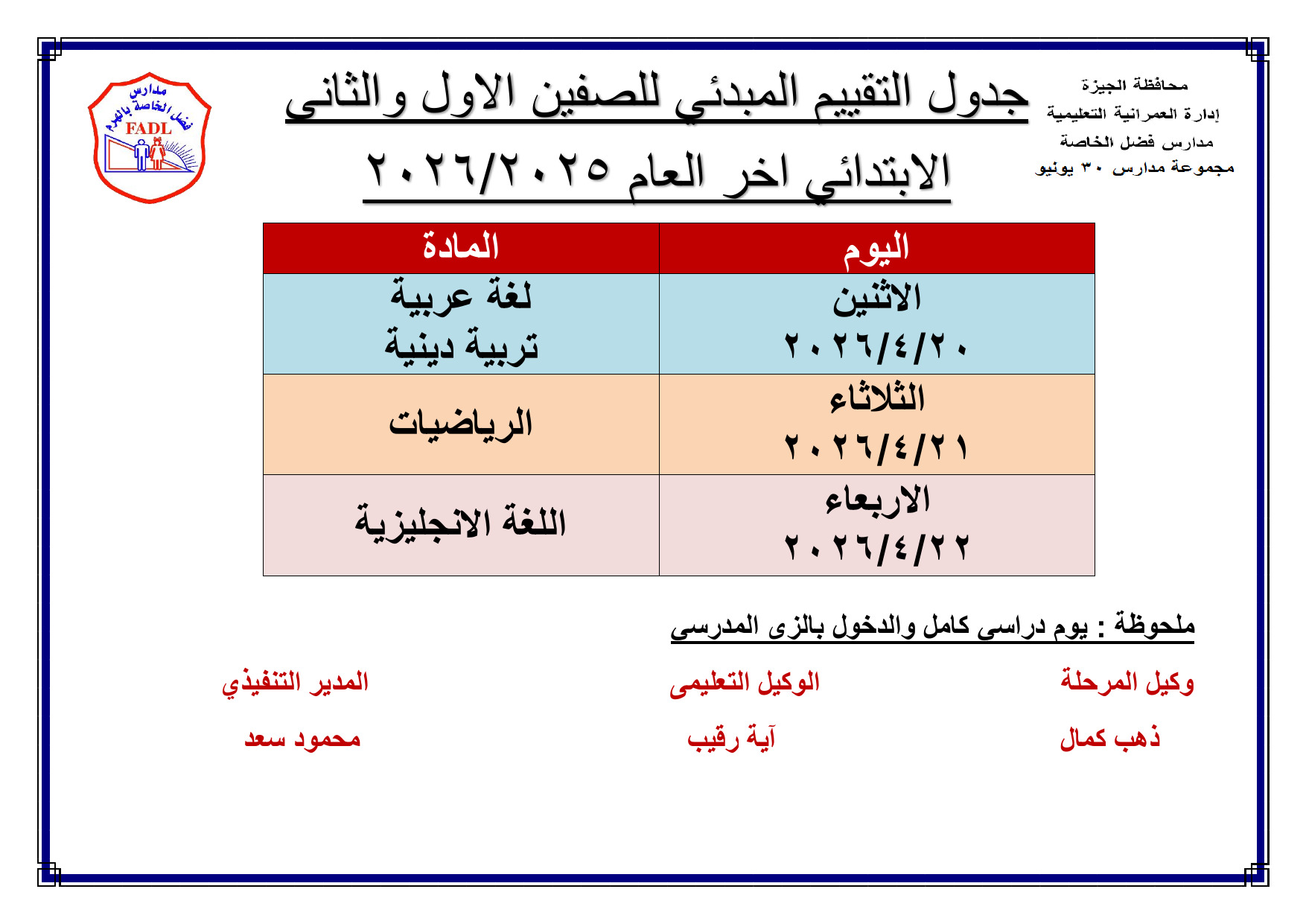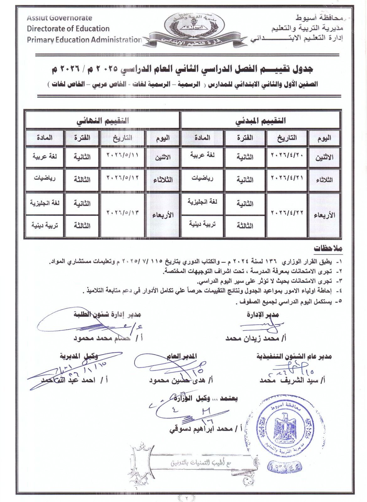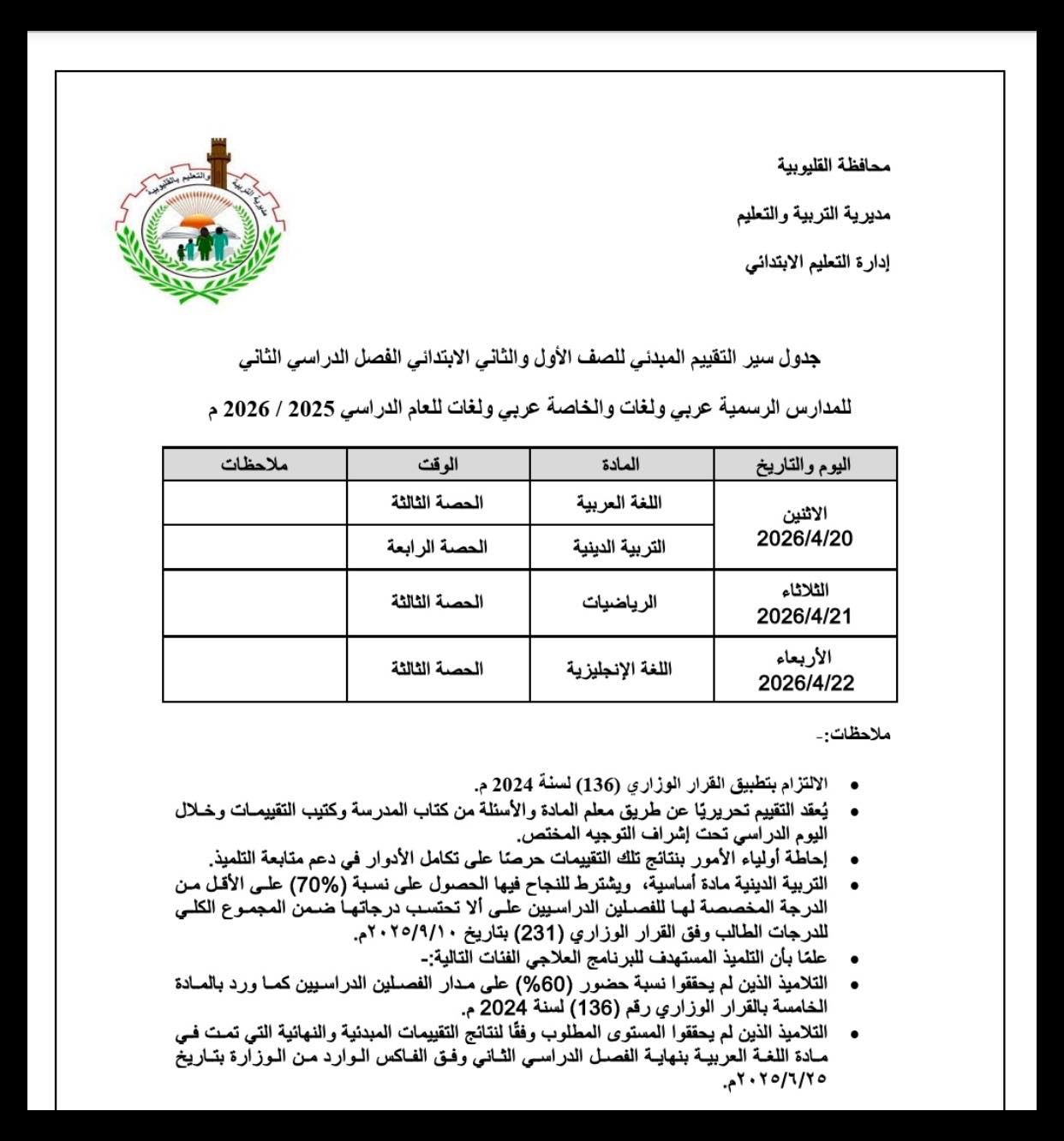 يأتي ذلك تنفيذاً لقرارات وزارة التربية والتعليم والتعليم الفني ، التي قررت أن يكون موعد التقييم المبدئي للصفين الأول والثاني الإبتدائي الترم الثاني 2026 ، من 20 ابريل 2026 حتى 22 ابريل 2026