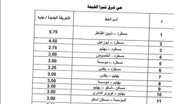 أصدر عبد الحميد الهجان محافظ القليوبية قرار رقم (287) لسنة 2024 الخاص بتعديل التعريفة الجديدة والمقررة لركوب سيارات الأجرة والسرفيس بدائرة المحافظة، إثر زيادة أسعار السولار بمقدار واحد جنيه للتر الذي أقره وزير البترول والثروة المعدنية، حيث قرر زيادة أسعار السولار بمقدار واحد جنيه للتر، فيما تستمر أسعار البنزين ثابتة بدون أي تغيير.