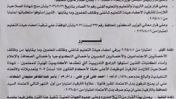 جاء ذلك بناء على القرار الصادر برقم 340 بتاريخ 20 أبريل 2026،، ومذكرة مديرية التربية والتعليم الخاصة باستصدار قرار ترقية بإجمالي عدد 1528 مستحقًا، من شاغلى وظائف المعلمين، وما يقابلها من وظائف الأخصائيين الاجتماعيين، والأخصائين النفسيين، وأخصائي التكنولوجيا، وإخصائي الصحافة والإعلام، وأمناء المكتبات، من دفعة 2019، وذلك من الذين منحوا شهادة الصلاحية اللازمة للترقية إلى الوظائف الأعلى.