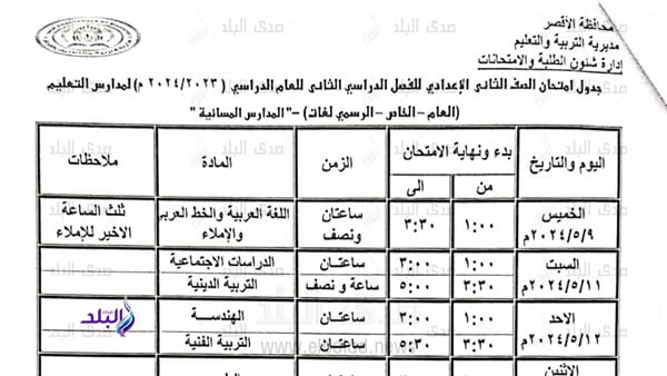 أعلنت مديرية التربية والتعليم بمحافظة الاقصر عن جداول امتحانات الفصل الدراسى الثانى للعام الدراسى ٢٠٢٣ / ٢٠٢٤ وذلك للمراحل التعليمية الاعدادية والتى تبدأ فى 6 مايو المقبل وتنتهى لجميع المراحل فى 24 مايو المقبل.