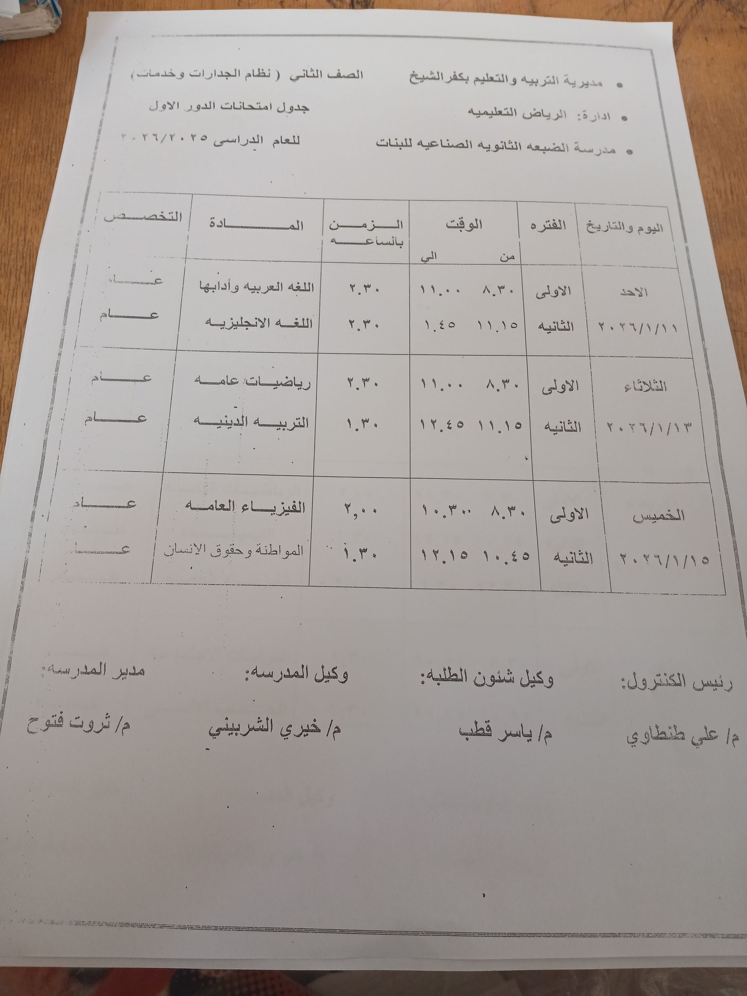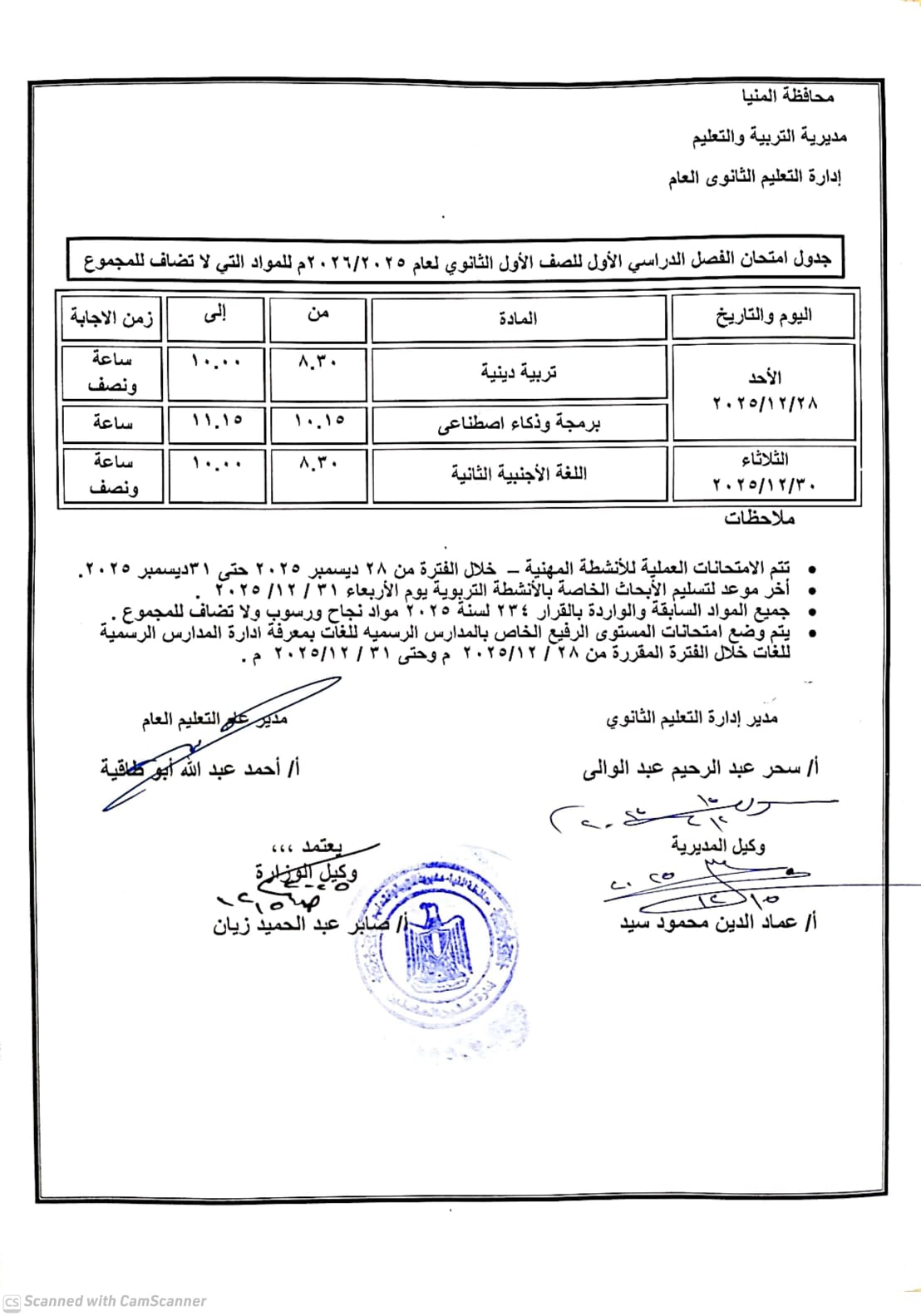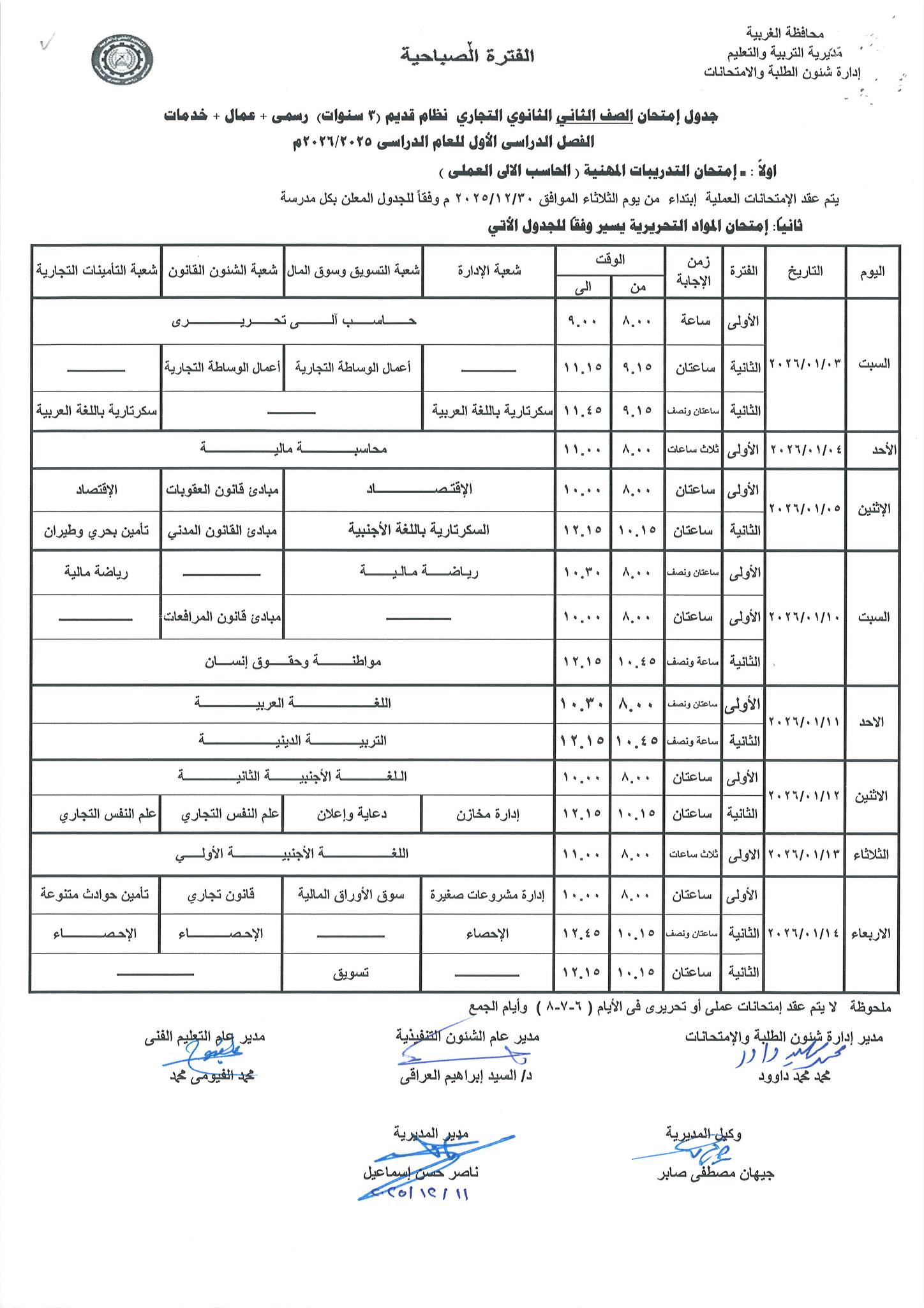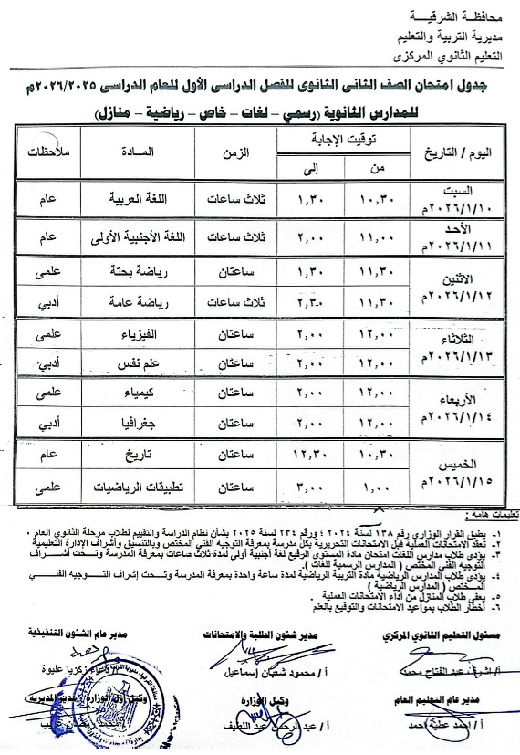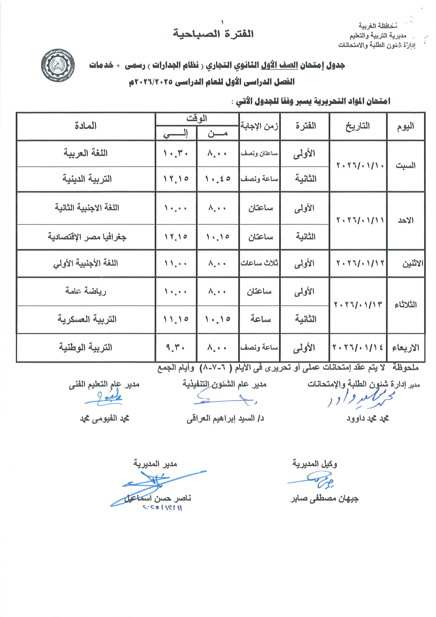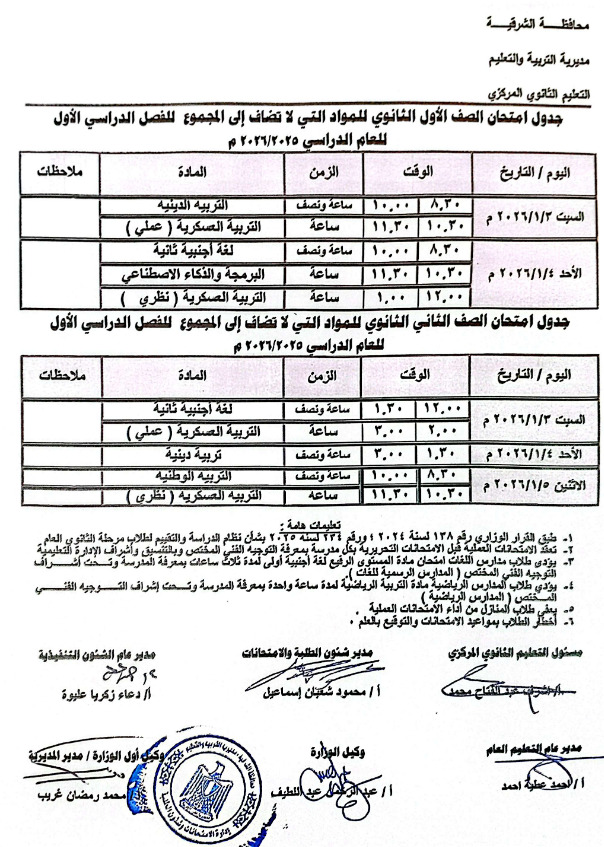 وراعت مديريات التربية والتعليم والتعليم الفني عند وضع جدول امتحانات الفصل الدراسي الاول 2026 جميع الصفوف ، عدم عقد أي امتحانات في أيام الأعياد تنفيذا لتعليمات وزير التربية والتعليم والتعليم الفني .