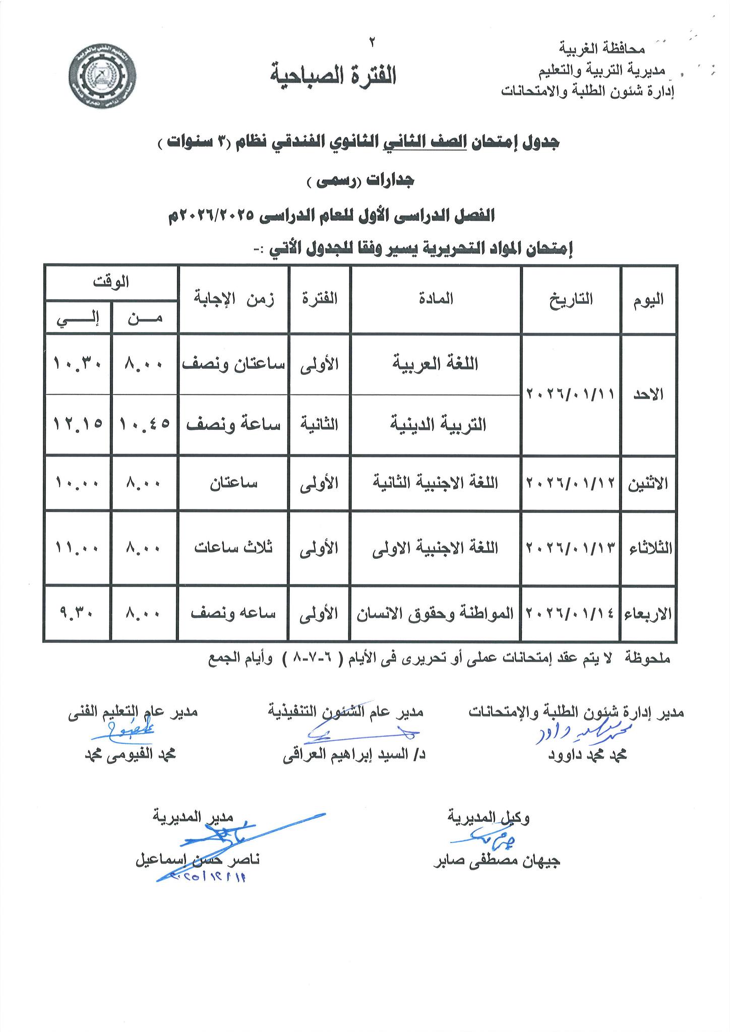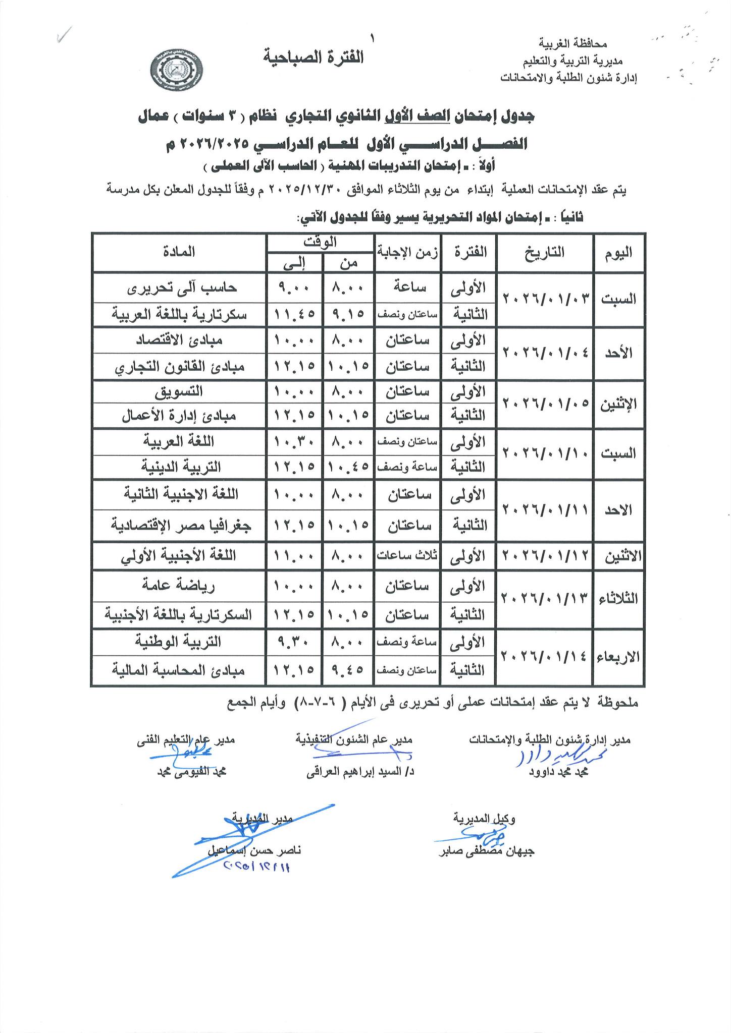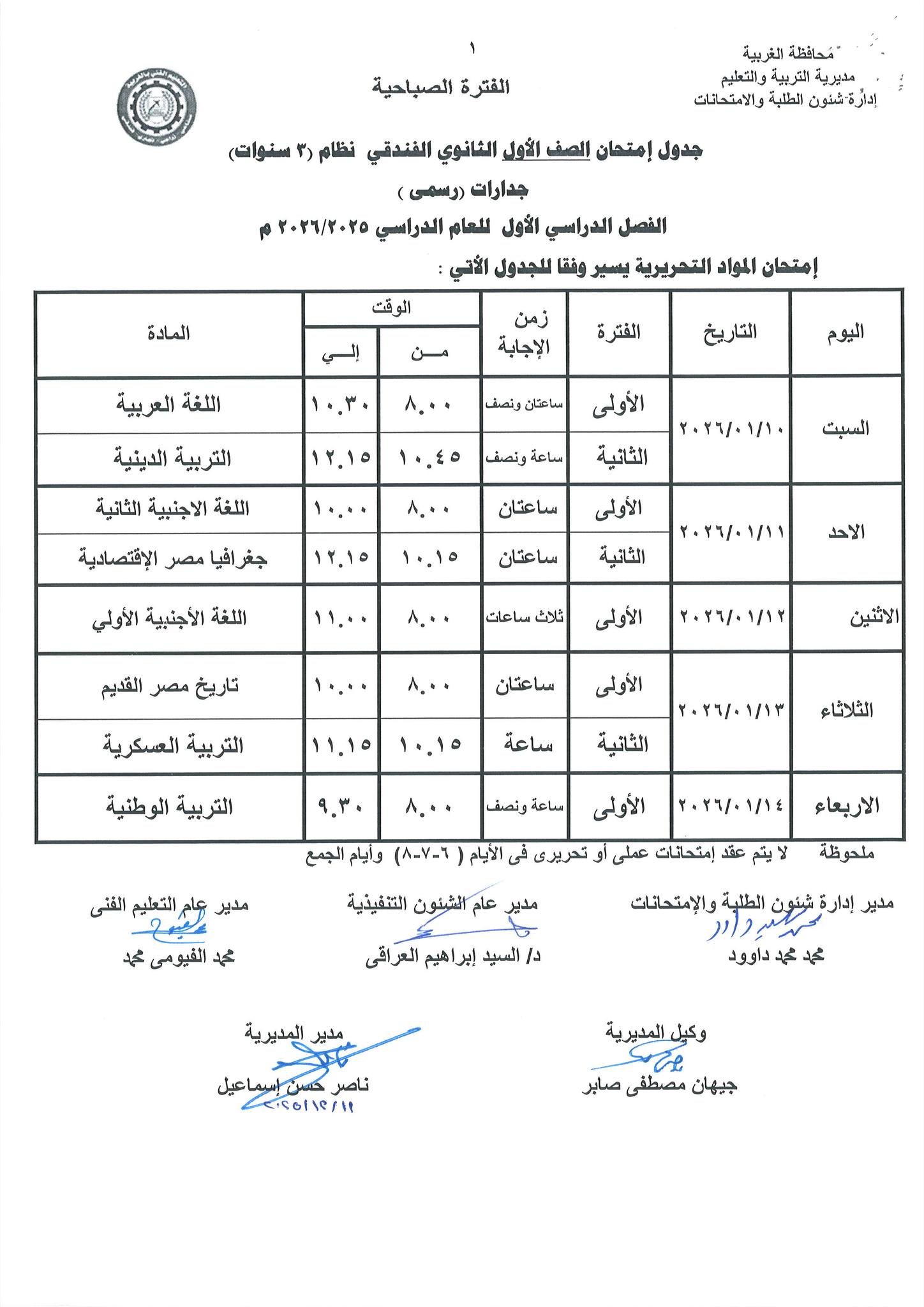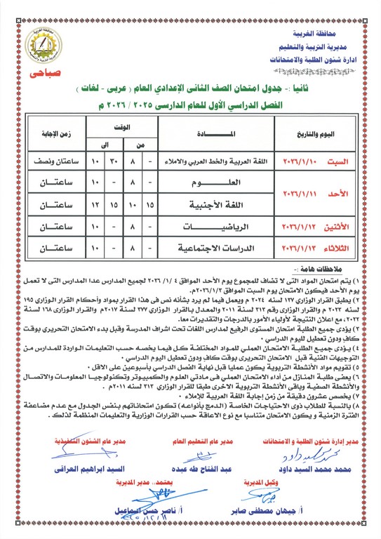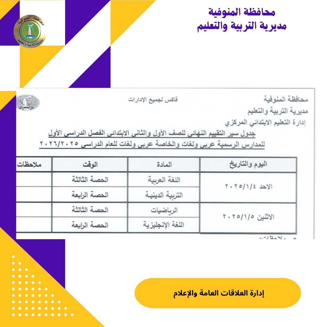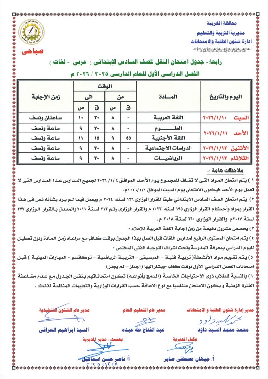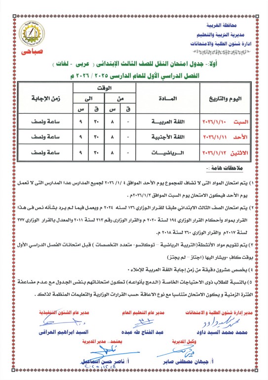 وتصدر كل مديرية من مديريات التربية والتعليم بيانات رسمية لإعلان جدول امتحانات الفصل الدراسي الاول 2026 جميع الصفوف ، ويتم نشر هذه البيانات على الصفحات الرسمية لكل مديرية على موقع التواصل الإجتماعي فيس بوك