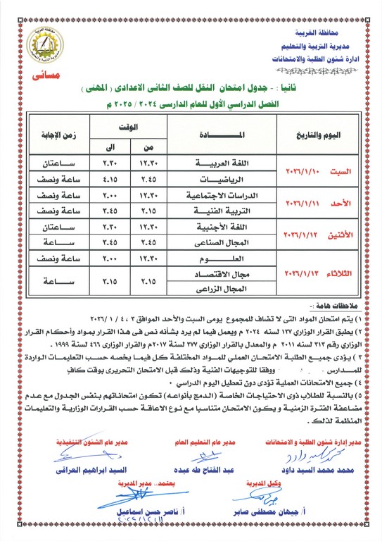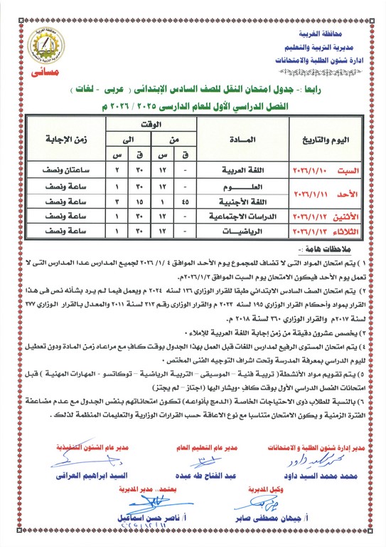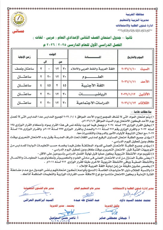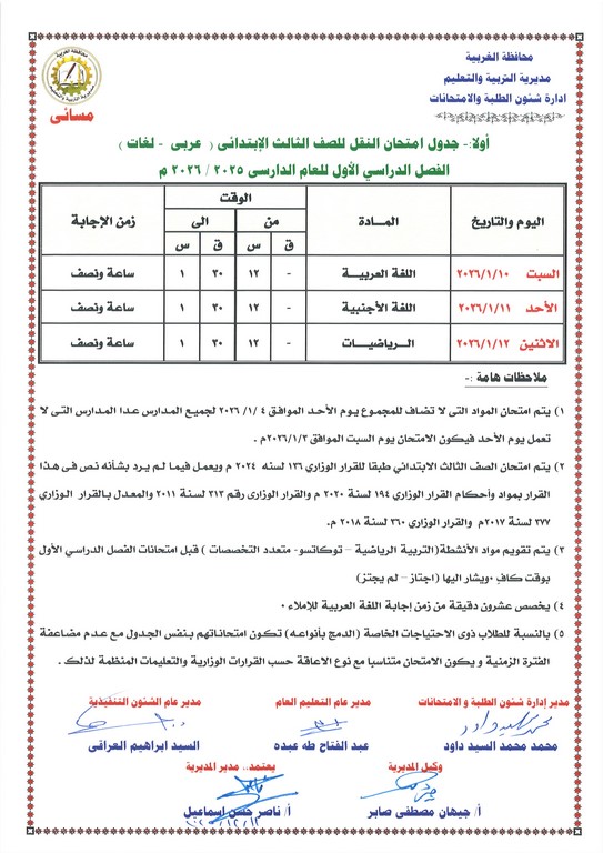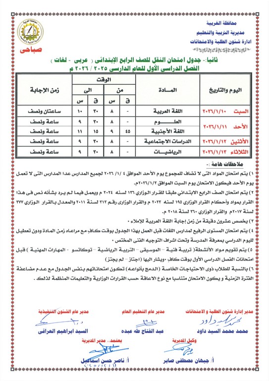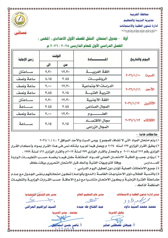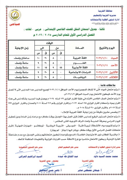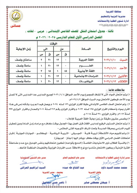 أعلنت مديريات التربية والتعليم جدول امتحانات الفصل الدراسي الاول 2026 جميع الصفوف “النقل والشهادة الإعدادية”