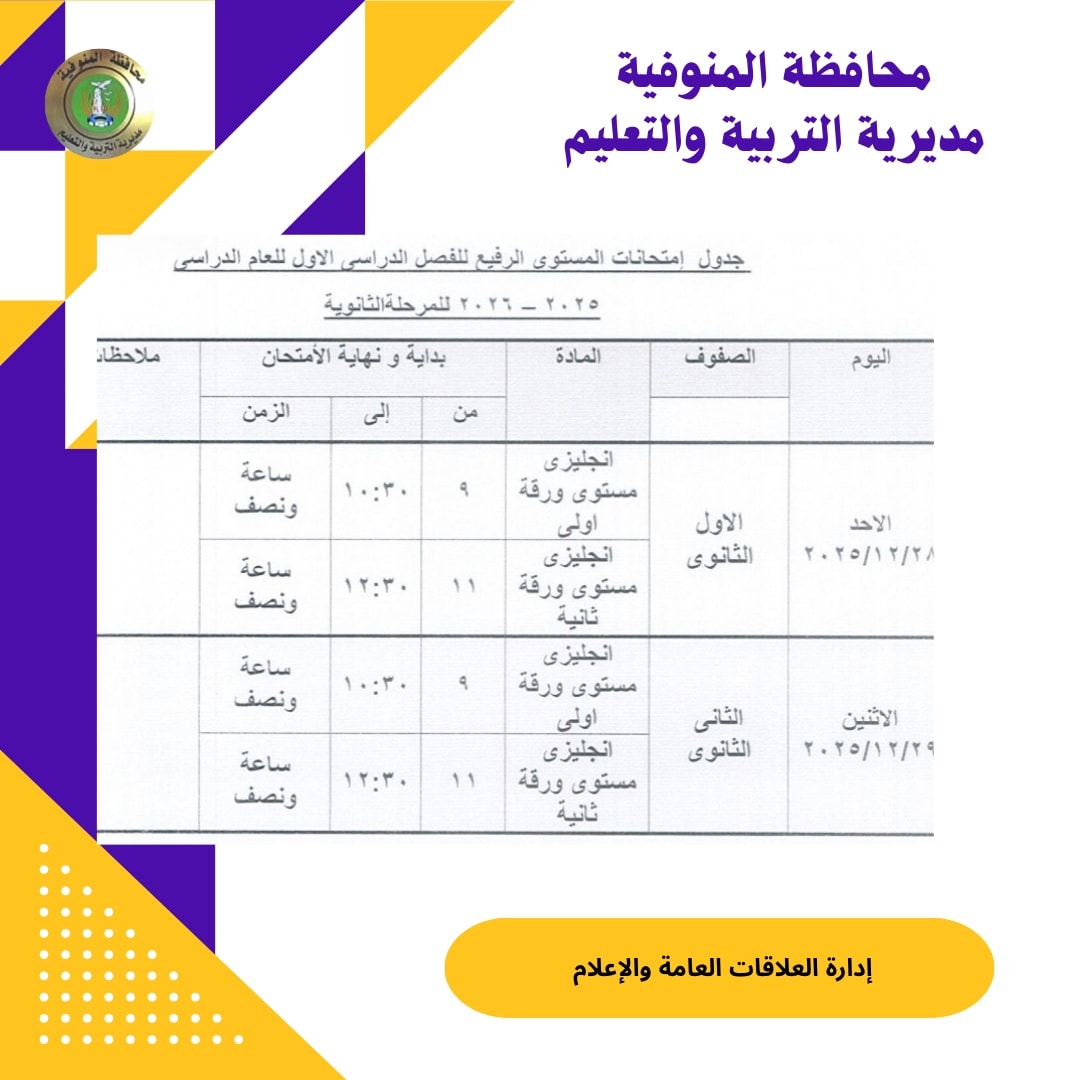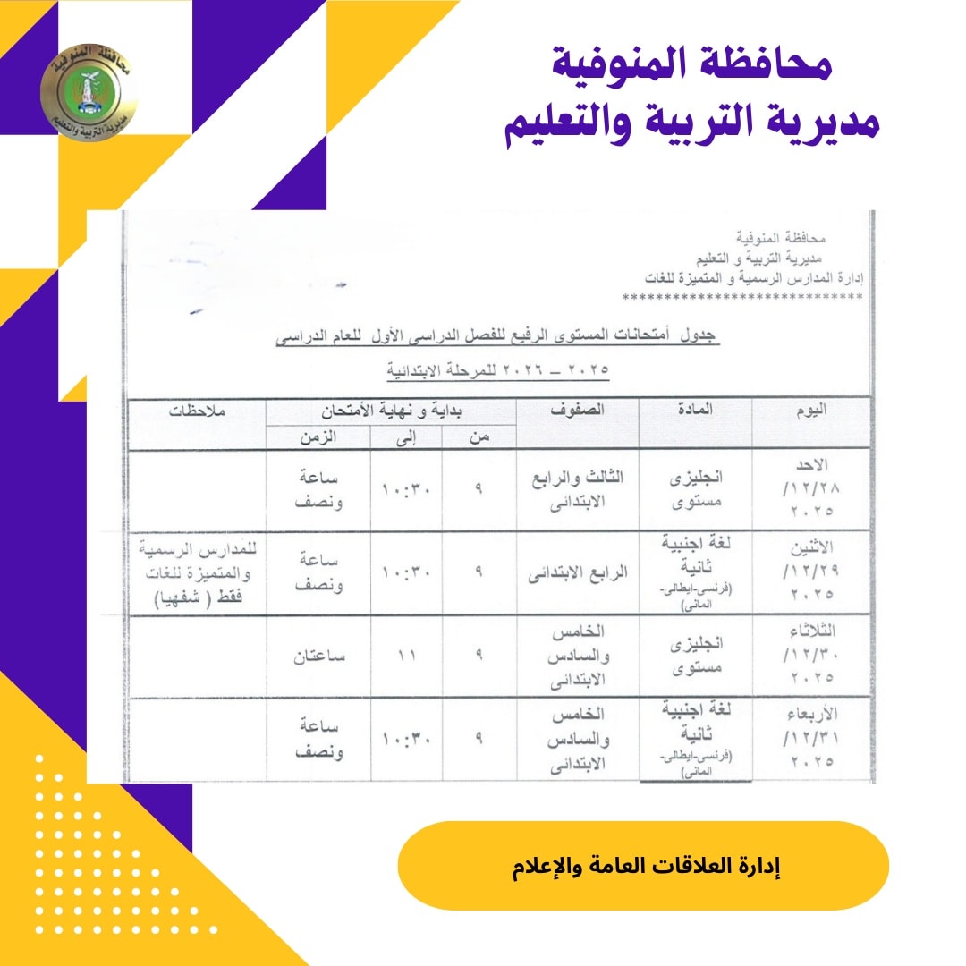 وأكدت مديريات التربية والتعليم التي أعلنت جدول امتحانات الفصل الدراسي الاول 2026 جميع الصفوف ، أن امتحان المستوى الرفيع اللغة الأجنبية يعقد بمعرفة المدرسة وتحت إشراف التوجيه الفني المختص