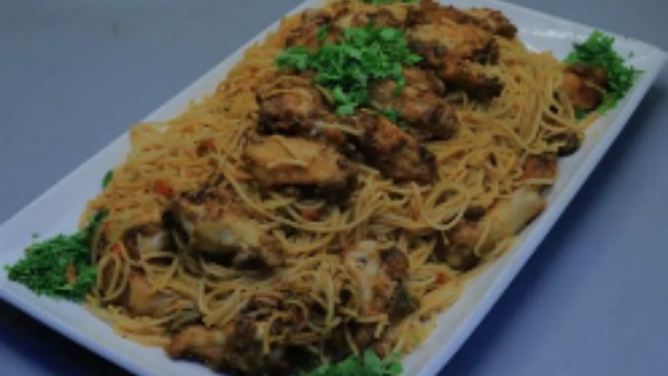 ويترك حتى تمتزج المكونات ثم تضاف الأجنحة ثم تضاف المكرونة الاسباجيتي