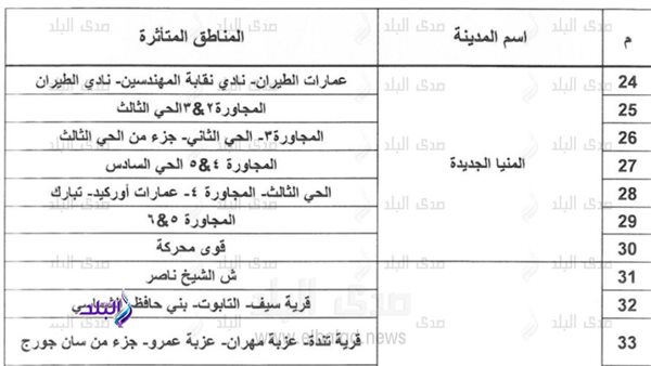 وتنفذ خطة تخفيف الأحمال للمرحلة الأولي من الساعة 12- 15 بمركز مغاغة بقرية برطباط وتوابعها ومنطقة أبو العزائم، جزء من امتداد السكة الحديد قبلي، وشارع طه حسين، وعمارات سكنية طه حسين الكردون، وعزبة الكيلو، ومنطقة شارع الساقية، وجزء من الطراد، وتقسيم احمد حسن، والشهواني، والمطافئ والأتوبيس، والثانوية، والصرف ومستشفي الجارحى