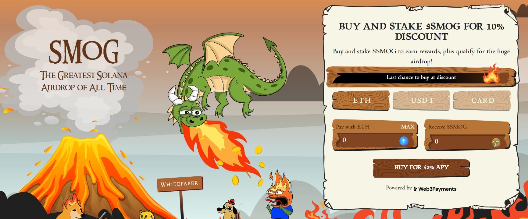 يعمل كل $SMOG بمثابة تذكرة دخول إلى مجتمع العملات المشفرة “The Dragon's Court” – مما يجعل محافظ حامليها مؤهلة للإسقاط الجوي.