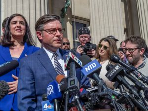 دعا رئيس مجلس النواب مايك جونسون رئيس جامعة كولومبيا إلى الاستقالة يوم الأربعاء خلال مؤتمر صحفي متوتر حيث قاطع الحشد…