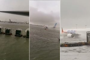 أظهرت مقاطع فيديو -متداولة على منصات التواصل الاجتماعي- طائرة ركاب تهبط في مطار دبي وسط سيول تغمر المدرج جراء المنخفض…
