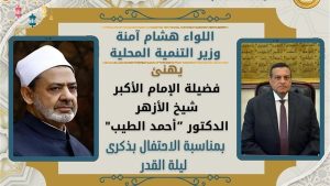 أرسل اللواء هشام آمنة، وزير التنمية المحلية، برقية تهنئة إلى فضيلة الإمام الدكتور أحمد الطيب، شيخ الأزهر الشريف، بمناسبة الاحتفال…