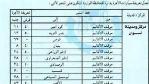 نستعرض عبر منصة ” صدى البلد ” التعريفة الجديدة لخطوط السير الداخلية والخارجية لسيارات السيرفيس والتاكسى بمراكز ومدن محافظة أسوان…