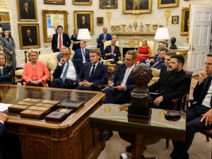 أثارت صورة اجتماع الرئيس الأميركي دونالد ترامب بعدد من زعماء أوروبا في البيت الأبيض موجة سخرية وانتقادات واسعة عبر منصات التواصل الاجتماعي، وذلك لأن المشهد غير مألوف في الأعراف الدبلوماسية والبروتوكولات المتبعة في مثل هذه اللقاءات الرفيعة.وأظهرت الصورة ترامب جالسا خلف مكتبه في المكتب البيضاوي، والقادة الأوروبيون أمامه على مقاعد خشبية صغيرة نسبيا، في مشهد وصفه ناشطون بأنه أقرب إلى جلوس تلاميذ أمام معلمهم في انتظار التعليمات.وفي المقابل، نشر البيت الأبيض صورتين من اللقاء: الأولى للرئيس ترامب أمام الزعماء الأوروبيين، والثانية للزعماء الأوروبيين أمام ترامب، وأرفقها بتعليق: “يوم تاريخي في البيت الأبيض، حيث انضم قادة أوروبيون إلى الرئيس ترامب في…