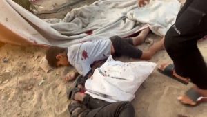 استشهد 3 فلسطينيين وأصيب آخرون بجروح إثر قصف شنته مسيّرة إسرائيلية على خيمة للنازحين في مواصي خان يونس جنوبي قطاع غزة.كما أصيب عدد من الأطفال الذين كانوا يجمعون الحطب والورق بجوار الخيمة المستهدفة، ونقلوا إلى مجمع ناصر الطبي في المدينة لتلقي العلاج.
