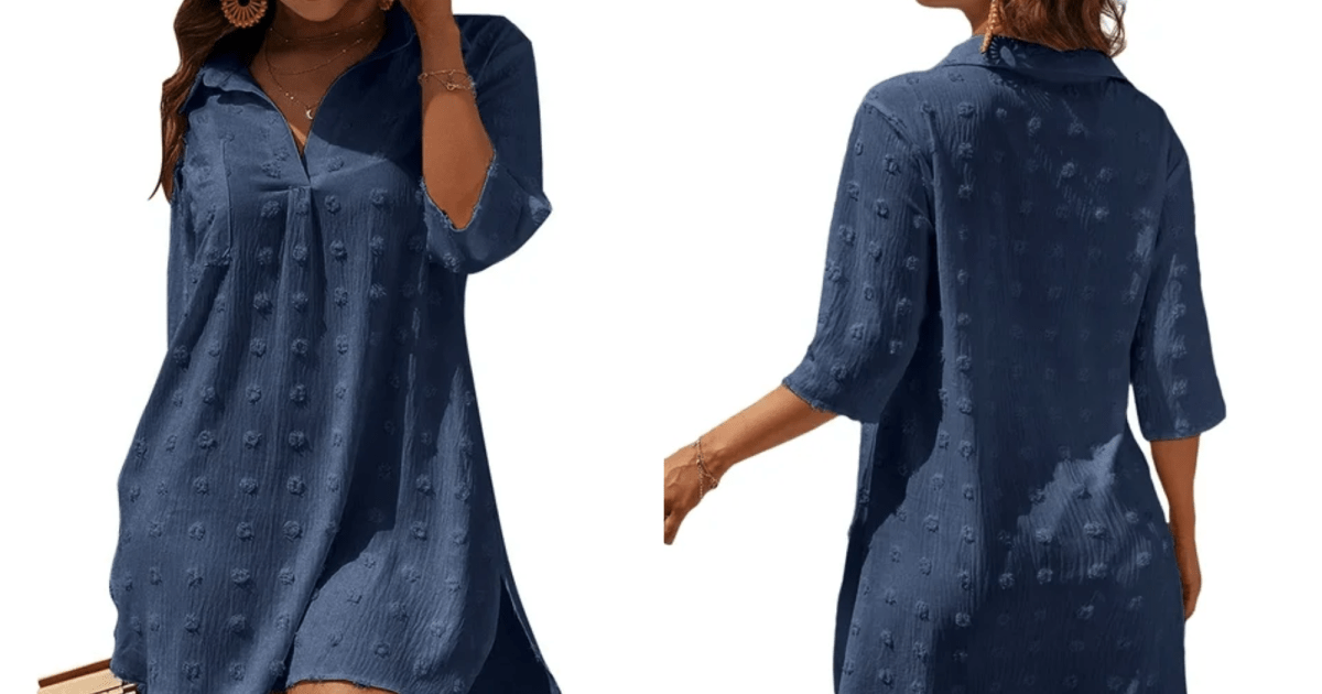 لقد وجدنا غطاءًا لطيفًا بشكل خاص في Walmart مقابل 15 دولارًا فقط. فستان قميص بوم بوم فضفاض من الشيفون من UVN أنيق للغاية، ويمكنك ارتداؤه بدون ملابس سباحة – وقد ترغبين في ذلك، نظرًا لمدى روعة هذا الفستان. هذا هو الخيار الأمثل للتبريد بجانب حمام السباحة أو للاختتام بمجرد تجفيف الهواء من السباحة.