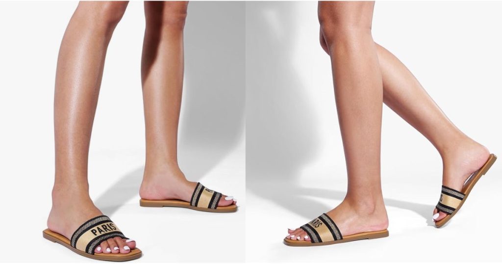 تتميز هذه الصنادل المنزلقة بتصميم سميك بحزام واحد يجعلها تبدو فاخرة، خاصة وأن الحزام محفور عليه كلمة “باريس” في الأمام والوسط. ستحبين التباين بين درجات اللون البني الداكن والأسود! يمنح التصميم البسيط والألوان المحايدة هذه الصنادل مظهرًا أنيقًا يتماشى مع أي زي تحلم به.
