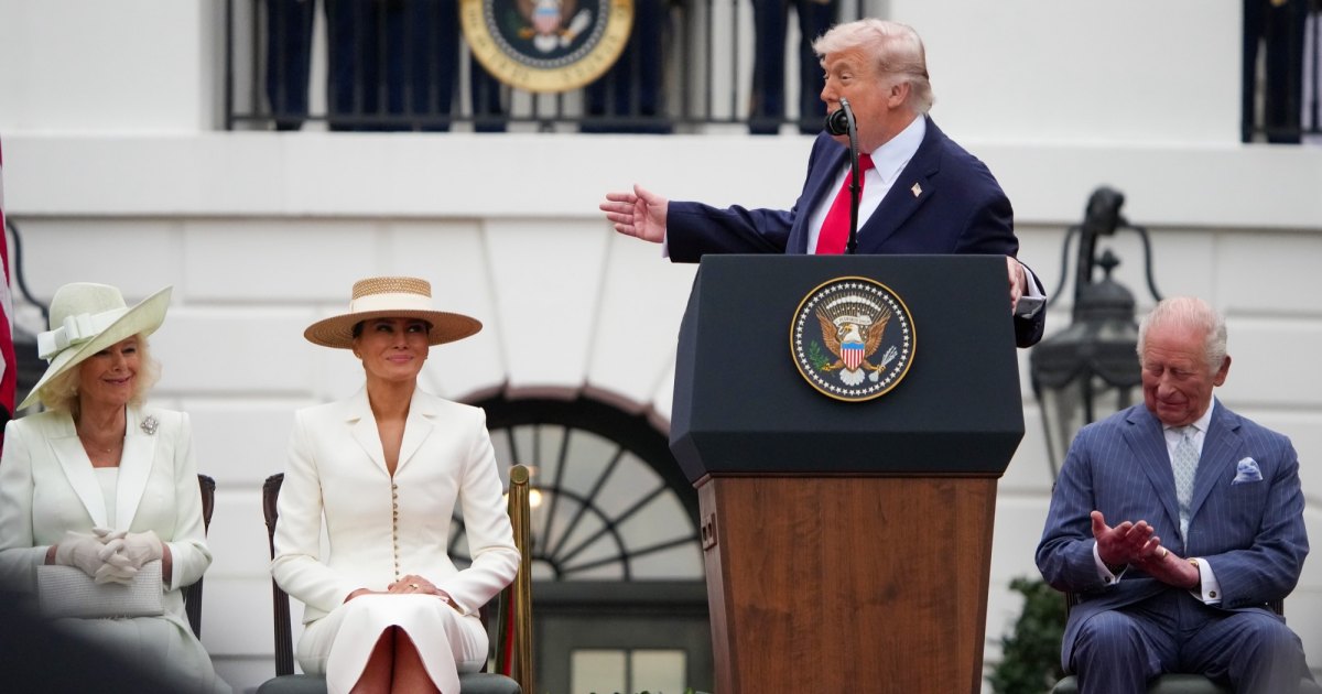 الرئيس دونالد ترامب قاطعت خطاب التكريم التلفزيوني المباشر الملك تشارلزوصوله إلى الولايات المتحدة لإلقاء نكتة حول زواجه منها ميلانيا ترامب.