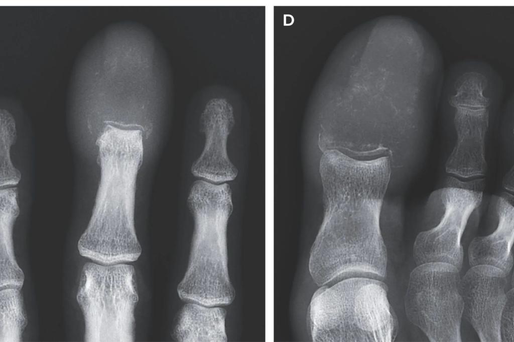 لكن الصور الشعاعية كشفت عن الحقيقة المرعبة: تم طمس كلتا العظام من خلال الآفات اللبنية ، حيث تحل الأورام محل بنية العظام بالكامل عند أطراف الإصبع وأصابع القدم.