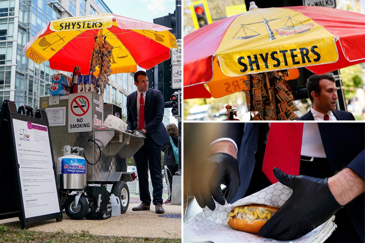 يقوم إسحاق ستاين، الذي يرتدي بذلة، بتشغيل عربة هوت دوج “Shysters” في عاصمة البلاد منذ أن جف التمويل للوكالات الفيدرالية في الأول من أكتوبر – حيث يقوم بتوصيل النقانق، ومون بايز، وآر سي كولا إلى سكان العاصمة.