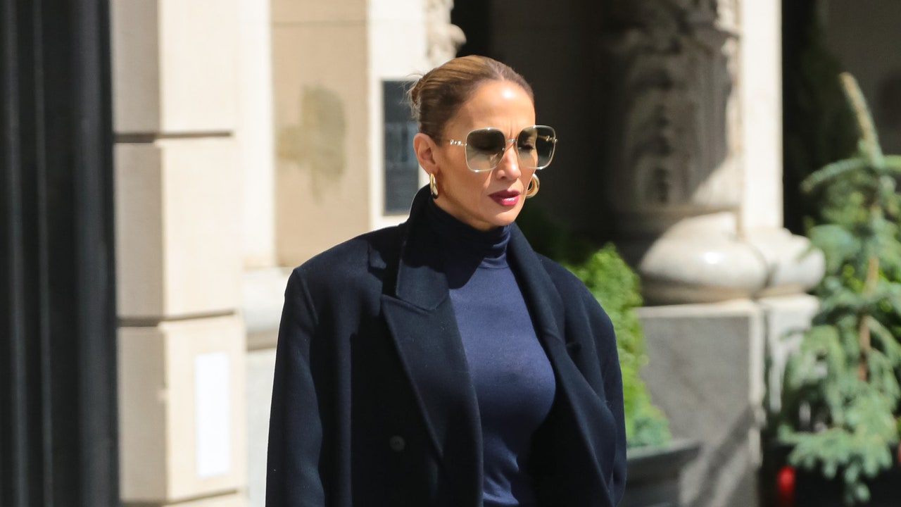 أما بقية المظهر ذو اللون الأزرق فكان من منطقة J.Lo الكلاسيكية. ارتدت سترة ضيقة ذات ياقة عالية باللون النيلي تحت معطف واقٍ من المطر مزدوج الصدر باللون الأزرق، وارتدت زوجًا من أحذية الدنيم ذات الكعب العالي ذات المقدمة المدببة. وربما يكون الأمر الأكثر صدقًا هو أنه لا يوجد زي جينيفر لوبيز الحاصل على براءة اختراع يكتمل بدون زوج من الأقراط الكبيرة والنظارات الشمسية كبيرة الحجم. (زوج اليوم: حلقات ذهبية وعدسات مربعة متدرجة.)
