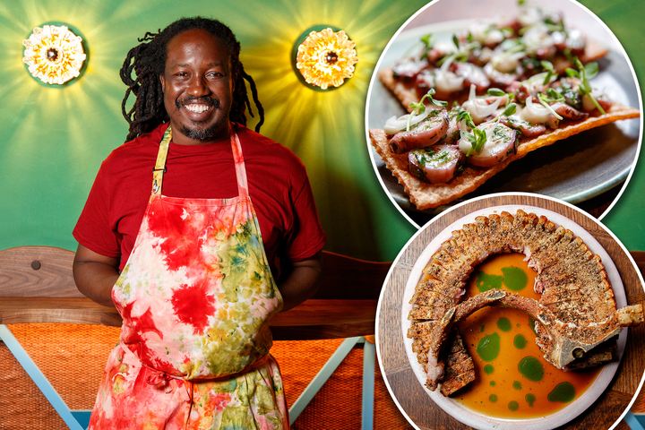 بدا باس البحر الأسود-الذي يتم تقديمه بجانب مجموعة صغيرة من الكاري الخشبي على الطراز الترينيدادي-الحد الأدنى على اللوحة ولكنه معبأة أقصى نكهة. تربط خبز الخبز ، مثل الخبز المسطح على غرار البيتزا ولكنه ذوقًا كثيرًا ، مع حلقات من الأخطبوط العطاء المستحيل وتشبع مع صلصة “الكلب” ، وهي بارتينة مصنوعة من البارسلي والليمون وهابانيرو من الكاريبي الفرنسي.