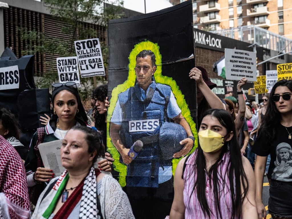 Protestors rally in front of Columbia University in support for Al Jazeera reporters Anas Al Sharif, Mohammed Qreiqeh, Ibrahim Zaher, Mohammed Noufal, freelance cameraman Momen Aliwa and freelance journalist Mohammed al-Khalidi, who were killed in Gaza City by an Israeli strike, in New York City, U.S., August 15, 2025. REUTERS/Ryan Murphy