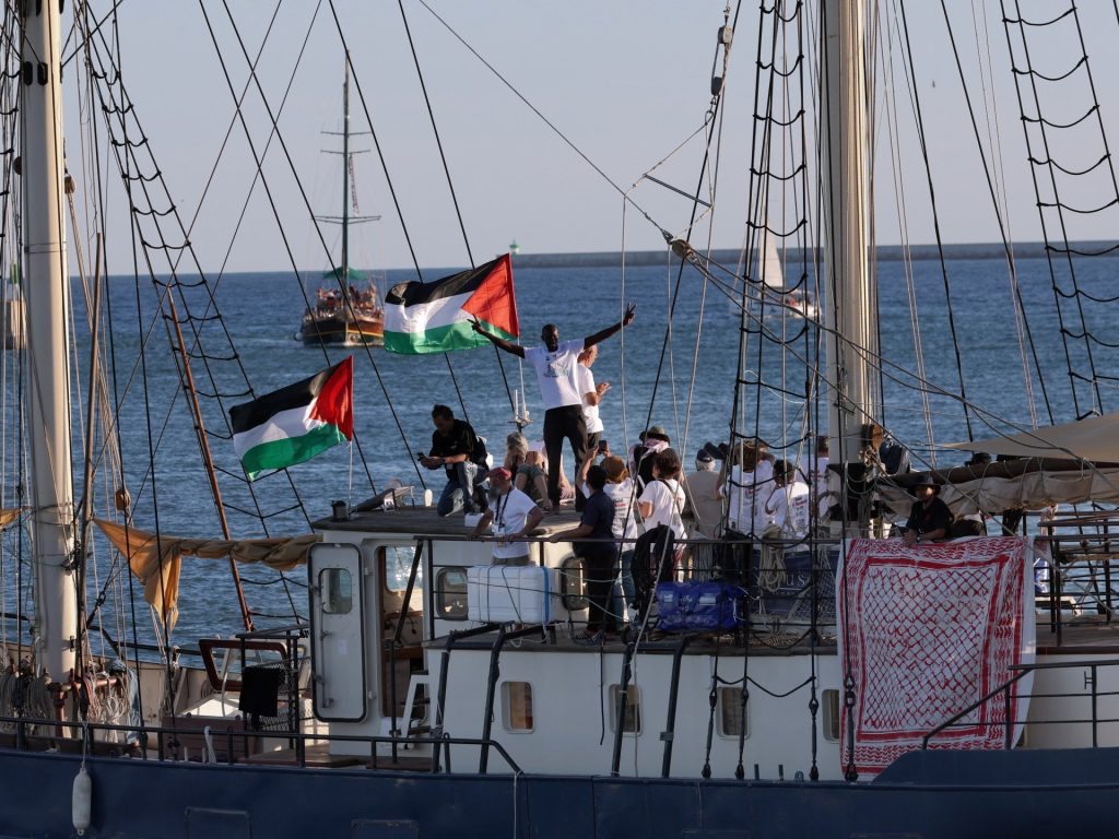 وأطلقت بعض القوارب التابعة لمهمة “أسطول الصمود العالمي” أبواقها أثناء مغادرتها الميناء، في حين هتف النشطاء في الميناء “حرروا فلسطين”.