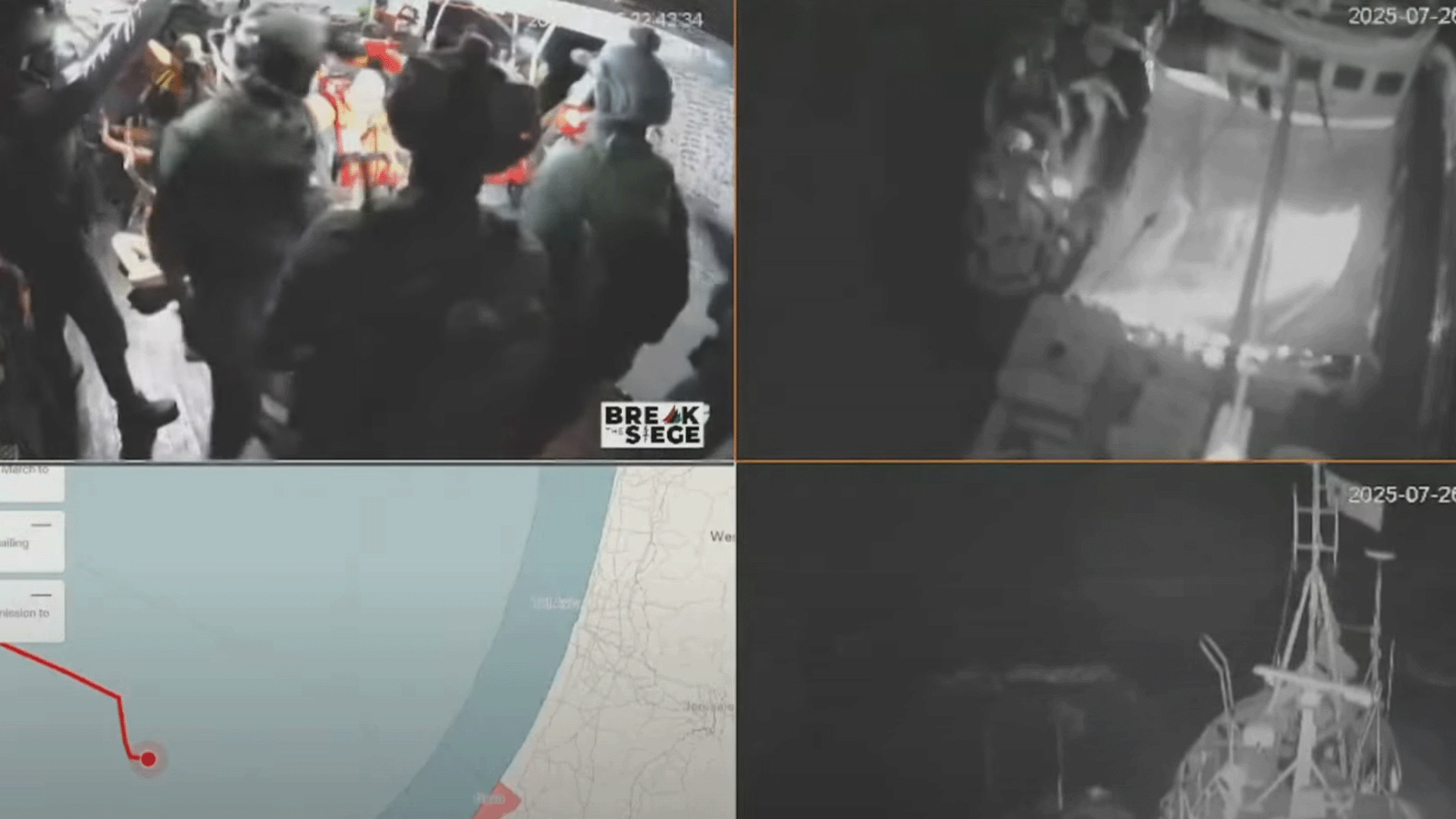 وبحسب الصور الأخيرة التي بُثت قبيل انقطاع الاتصال، ظهر جنود إسرائيليون وهم يصادرون كاميرات المراقبة، ويوقفون البث المباشر من السفينة، وسط إعلان حالة الطوارئ على متنها بعد اقتراب قاربين مجهولين وطائرات مسيرة إسرائيلية.