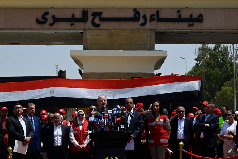 رئيس الوزراء الفلسطيني محمد مصطفى (وسط) برفقة وزير الخارجية المصري بدر عبد العاطي إلى يساره خلال مؤتمر صحفي على الجانب المصري من معبر رفح الحدودي (الفرنسية)