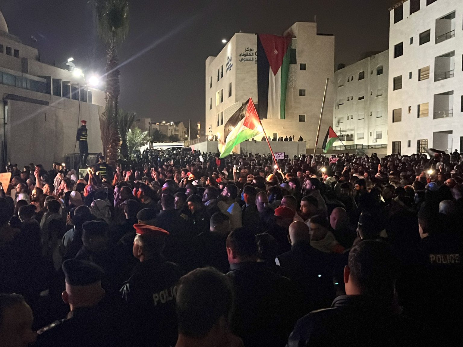 من جانب آخر، أكد بيان ثانٍ للأمن العام أمس الأحد اعتقال عدد من الأشخاص بينهم نساء “تجاوزوا وحاولوا الاعتداء على رجال الأمن العام” خلال المظاهرات التي وقعت بالقرب من السفارة الإسرائيلية في عمّان.