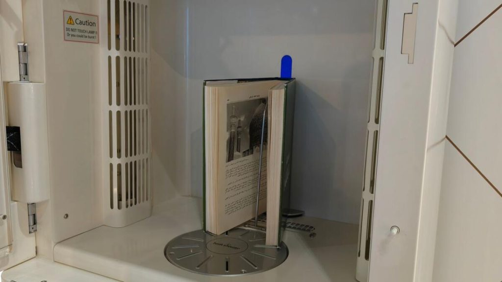 “باستخدام تقنيات متقدمة بالأشعة فوق البنفسجية، تقوم الآلة بتعقيم الكتب بشكل فعال، مما يحمي المستخدمين من المخاطر الصحية ويحافظ على الأهمية التاريخية والثقافية للمجموعة. كما يحتوي الجهاز على مروحة تعمل على تعقيم كافة الصفحات ونفخ مادة خفيفة. ينفخ الهواء لينشر كل الصفحات المفتوحة حتى يتم تعقيمها بشكل صحيح. تعمل الآلة على إطالة عمر الكتب وتضمن بقائها صالحة للاستخدام دون التسبب في أي ضرر.