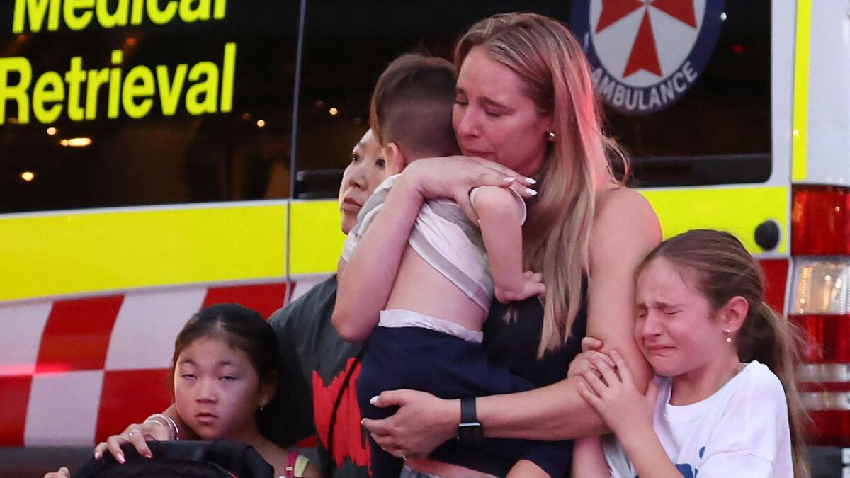 عائلة تغادر مركز تسوق ويستفيلد بوندي جنكشن بعد حادث طعن في سيدني يوم السبت. الصورة: وكالة فرانس برس