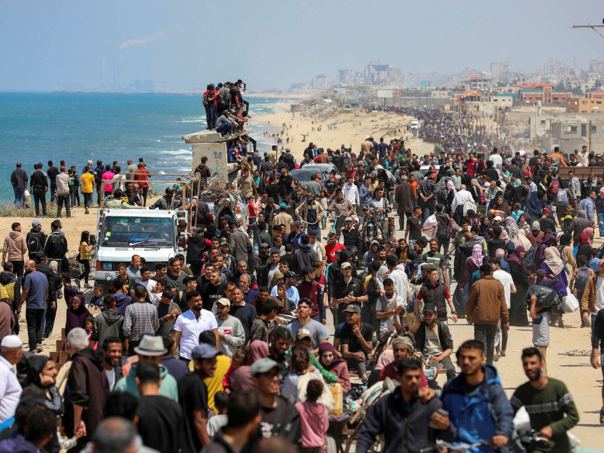 وأظهرت صور أعدادا كبيرة من النازحين المتجهين من جنوب قطاع غزة إلى الشمال عبر شارع الرشيد الساحلي.