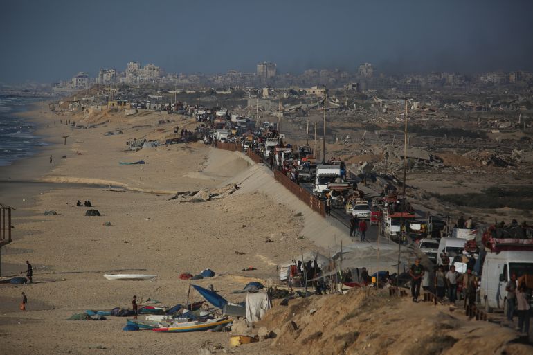 فلسطينيون ينزحون من مناطق في مدينة غزة عبر شارع الرشيد في اتجاه الجنوب (وكالة الأناضول)