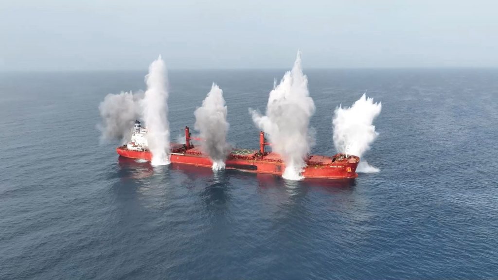 كذلك بث الإعلام الحربي التابع لجماعة الحوثي مشاهد استهداف سفينة أخرى تدعى “ماجيك سيز” وإغراقها في البحر الأحمر بعد هجوم نفّذته الجماعة الأحد الماضي.