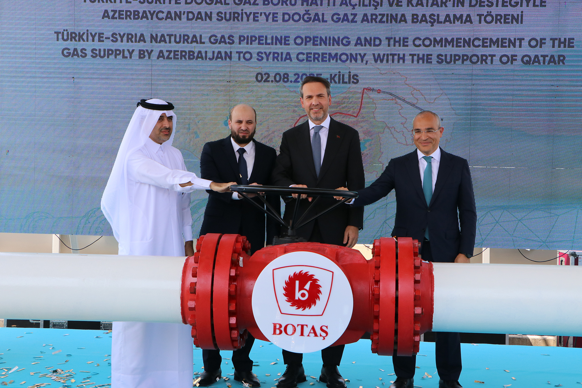 وأقيم حفل بهذه المناسبة بولاية كيليس التركية بمشاركة وزير الطاقة والموارد الطبيعية ألب أرسلان بيرقدار، ونظيره السوري البشير، ووزير الاقتصاد الأذربيجاني ميكاييل جباروف، ورئيس صندوق قطر للتنمية فهد حمد السليطي، وممثلين عن الدول المشاركة بالمشروع.