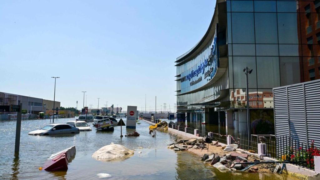 سيارات تقطعت بها السبل في شوارع الفيضانات في دبي بعد هطول أمطار غزيرة في 19 أبريل 2024. الصورة: وكالة فرانس برس