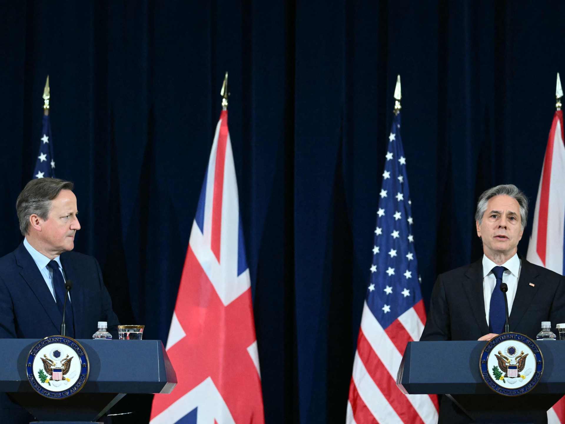 وأشار بلينكن للصحفيين، إثر اجتماعه مع وزير الخارجية البريطاني ديفيد كاميرون بمقر وزارة الخارجية الأميركية، إلى أن الإدارة الأميركية تتواصل مع الطرف الإسرائيلي بشأن توفير بدائل عن العملية البرية في رفح.