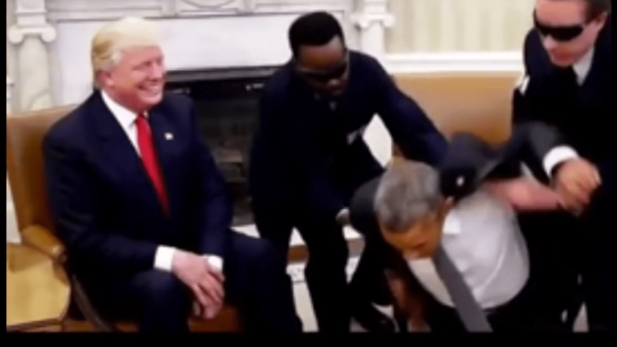 ويظهر المقطع الذي أعاد ناشطون مشاركته على منصة “إكس” ترامب جالسا إلى جانب الرئيس السابق أوباما داخل المكتب البيضاوي، قبل أن يتدخل عناصر من “مكتب التحقيقات الفدرالي” (FBI) لتقييد أوباما بالأصفاد، ثم يظهر راكعا على ركبتيه.