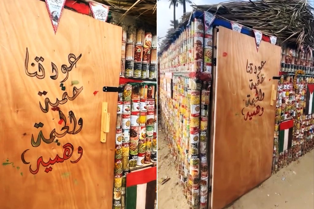 ونشر المصور والصحفي عبود السيد مقطع فيديو عبر حسابه على إنستغرام يظهر الخيمة وقد بنيت جدرانها بعدد ألفين من معلبات الفول والحمص والبازلاء والمرتديلا التي جاءت مع المساعدات الموزعة على النازحين من أهالي غزة.