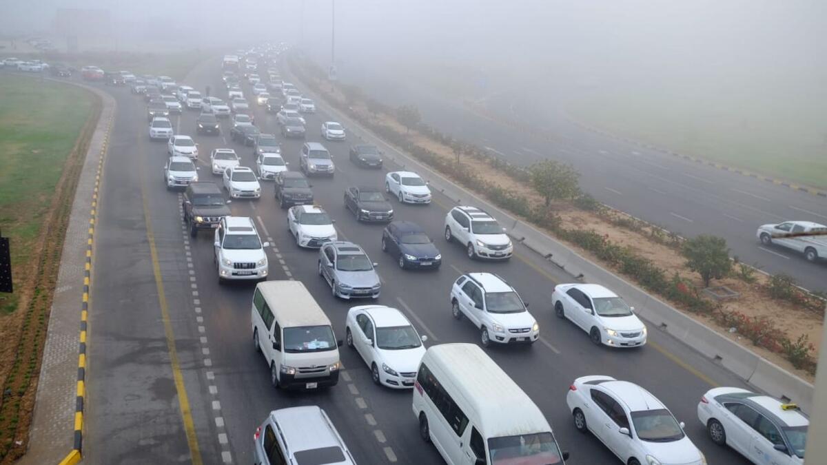 واجه سائقو السيارات الذين يضربون الطريق في دبي الضباب في مناطق مثل طريق الشيخ مكتوم بن راشد والمينهاد وجبل علي والفقع ومعرض إكسبو.