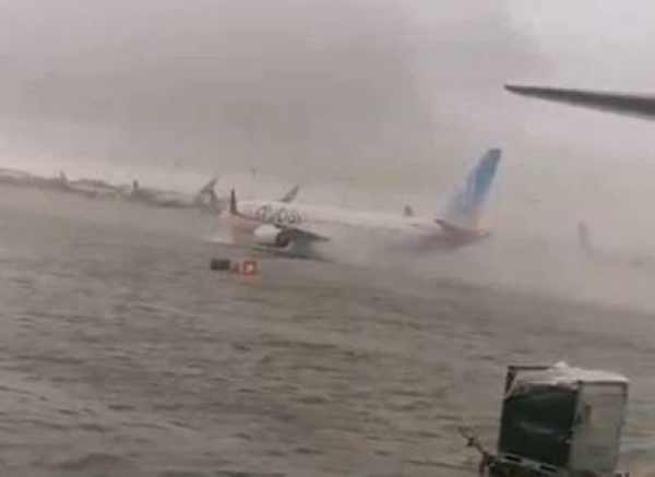 التقطت الصور الارتفاع المقلق في منسوب المياه في مطار دبي، حيث وقفت الطائرات على ما يبدو أنه ممر مائي مؤقت وليس مدرجًا عاملاً.