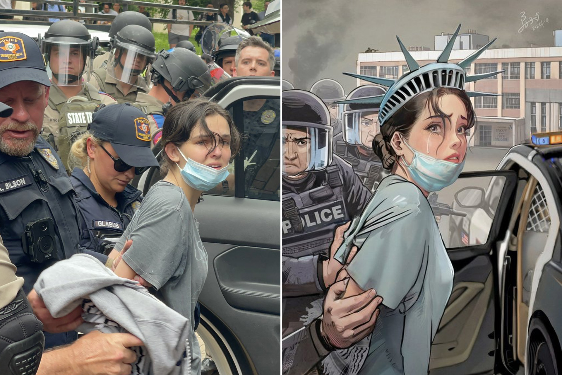 وقد قام رسام برسم لحظة اعتقال الشرطة للفتاة وألبسها التاج الذي يعلو رأس تمثال الحرية والدموع تنهار من عينيها ونظراتها التي تعبر عن ألمها لاعتقالها.