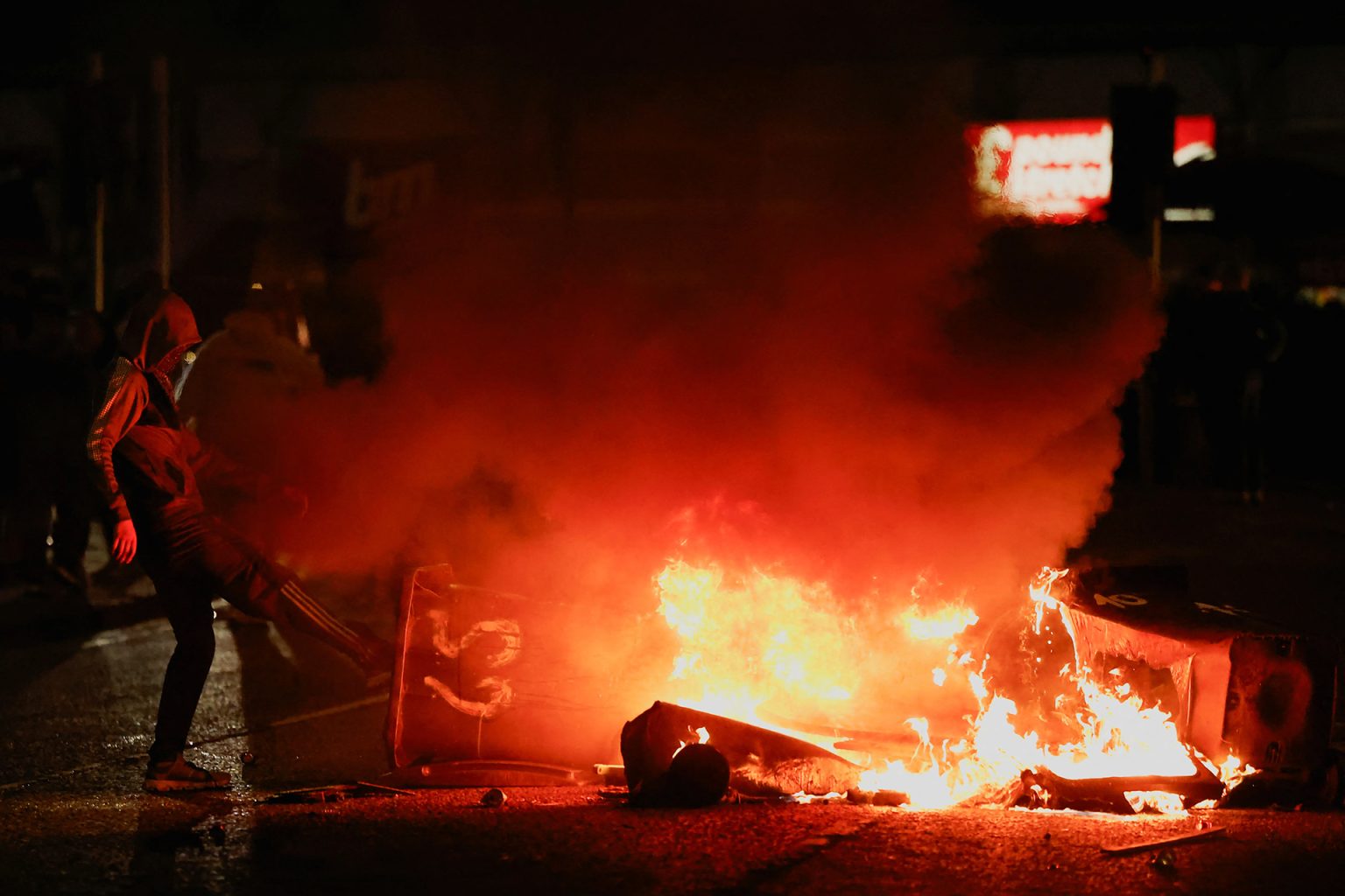 لكن الشرطة قالت، إن عدة أشخاص ملثمين انفصلوا عن الحشد وبدؤوا في إقامة حواجز ومهاجمة ممتلكات خاصة تسكنها عائلات مهاجرة، قائلة إنهم هاجموا ضباط الشرطة بقنابل الدخان، والألعاب النارية، والزجاجات، والطوب، مما أدى إلى اشتباكات استمرت عدة أيام.